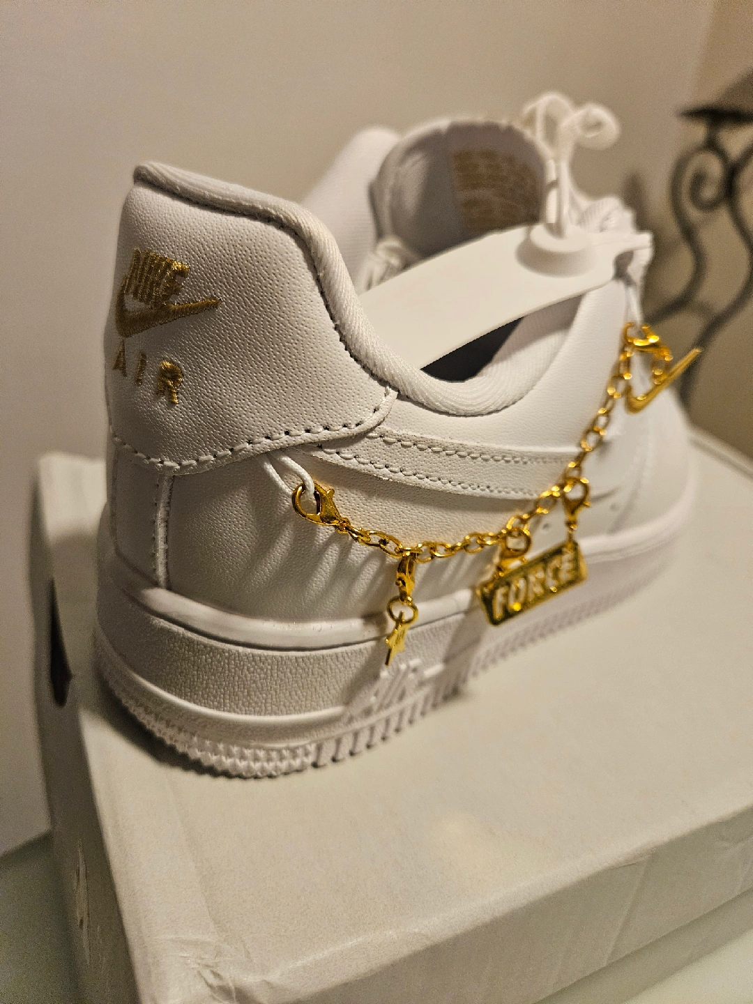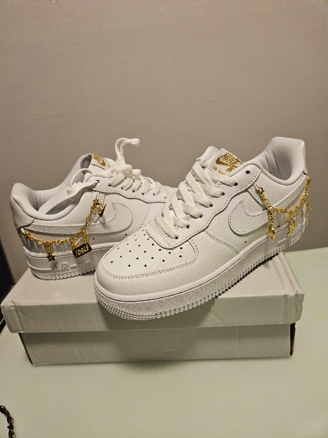 Brand new never worn, pair of Nike Air Force 1 '07 Lucly Charms in white. These are a women's size US 8, UK 5.5, EUR 39, CM 25. They also have gold charms attached!