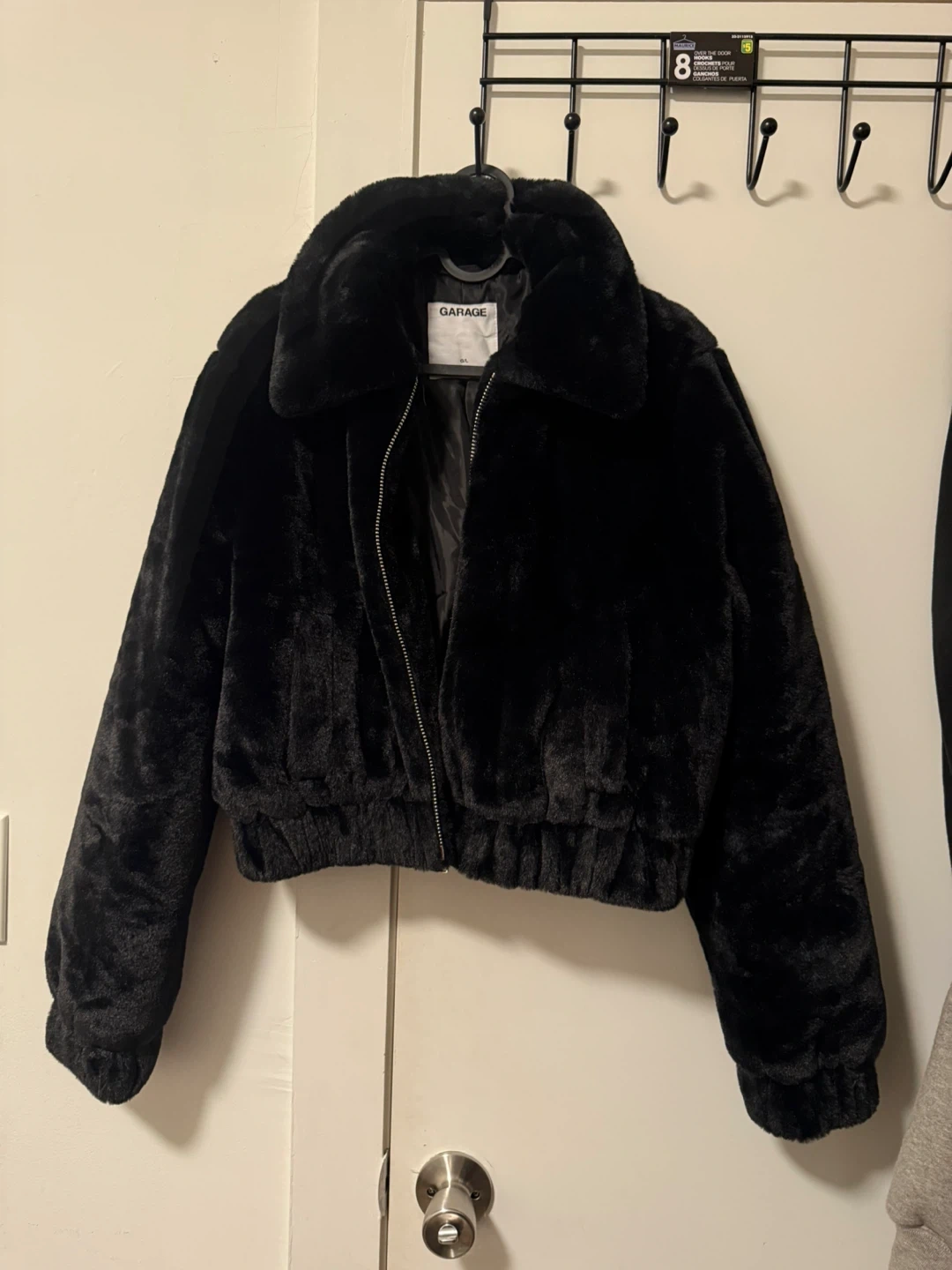74Cozy up in this black faux fur cropped jacket from Garage! It's a size large and in great condition. Perfect for adding a touch of warmth and style to your outfit!