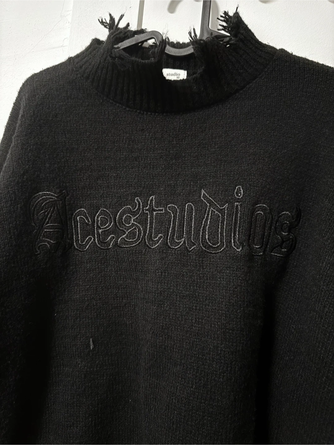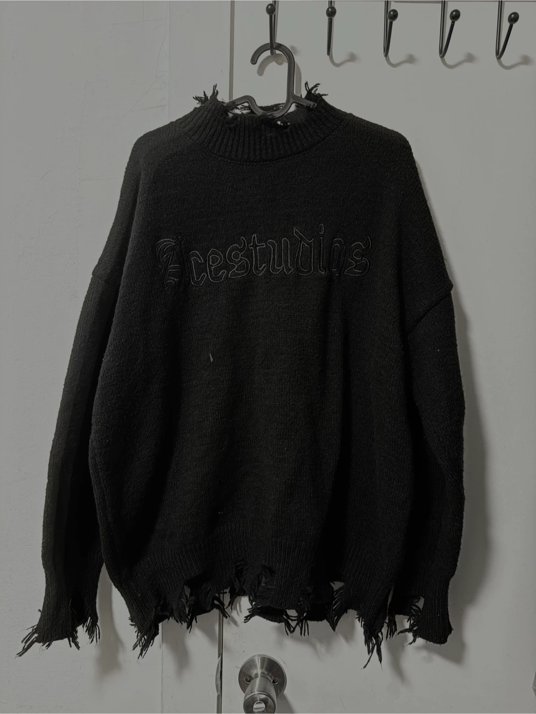 74Cozy up in this stylish Acestudios black sweater! It features a unique distressed design, giving it a cool, edgy look. Perfect for adding a bit of flair to your wardrobe!
