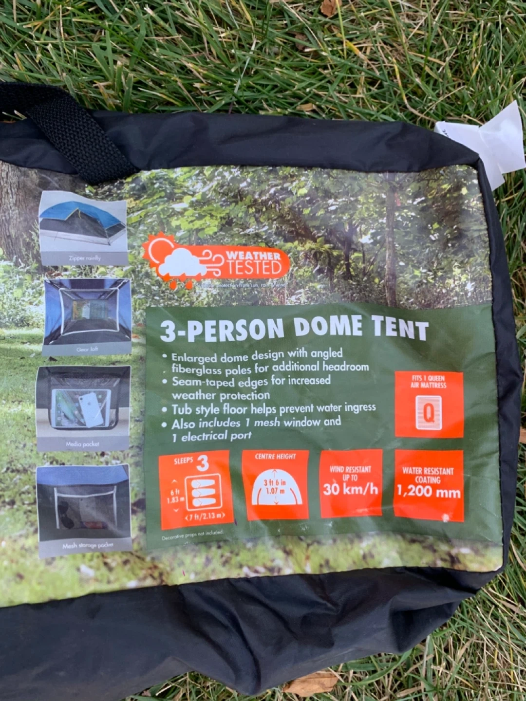 Selling an Ozark Trail 3-person dome tent. It's weather-tested and has seam-taped edges for increased weather protection. The tub-style floor helps prevent water from getting in, and it also includes a mesh window and an electrical port. It fits one queen air mattress and is wind-resistant up to 30 km/h. The water-resistant coating is 1,200 mm