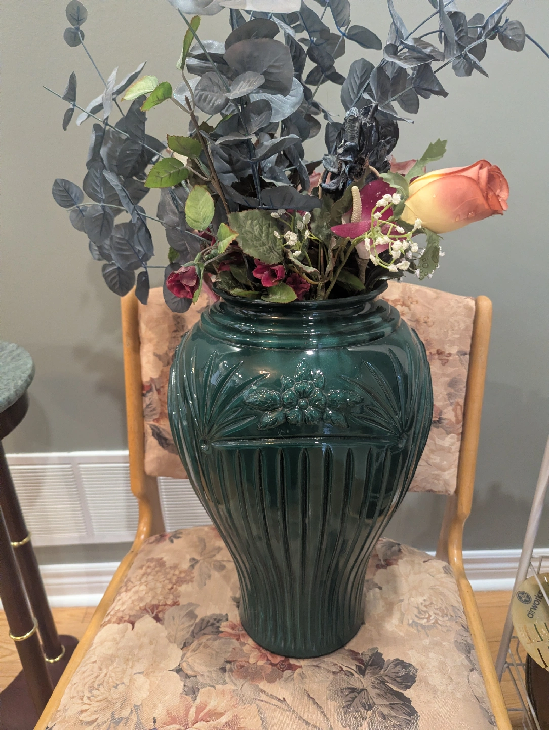20Selling a lovely green decorative vase. It has a beautiful floral design on the front and a unique ridged texture. This vase would be perfect for displaying flowers or as a standalone piece of decor in your home