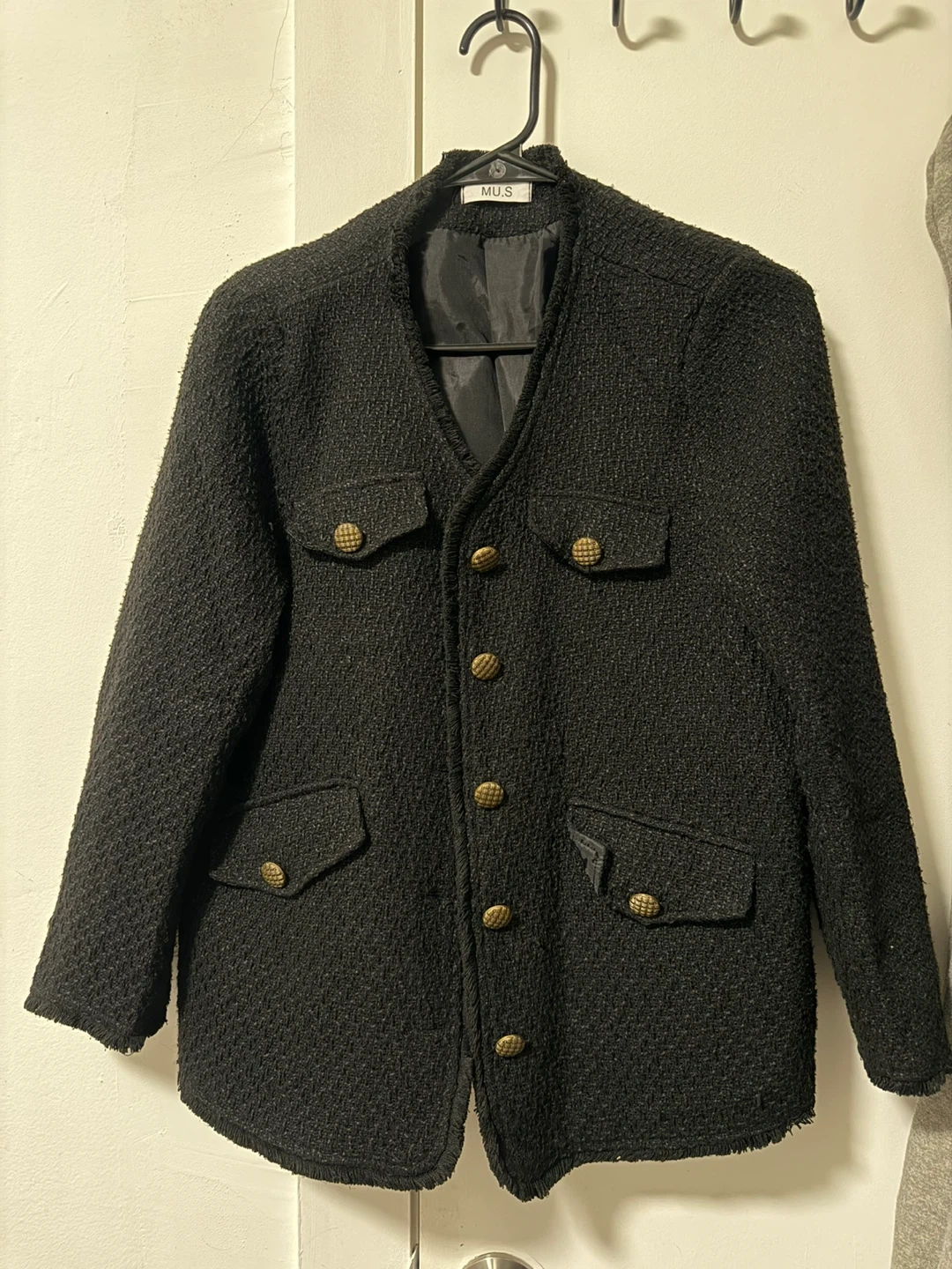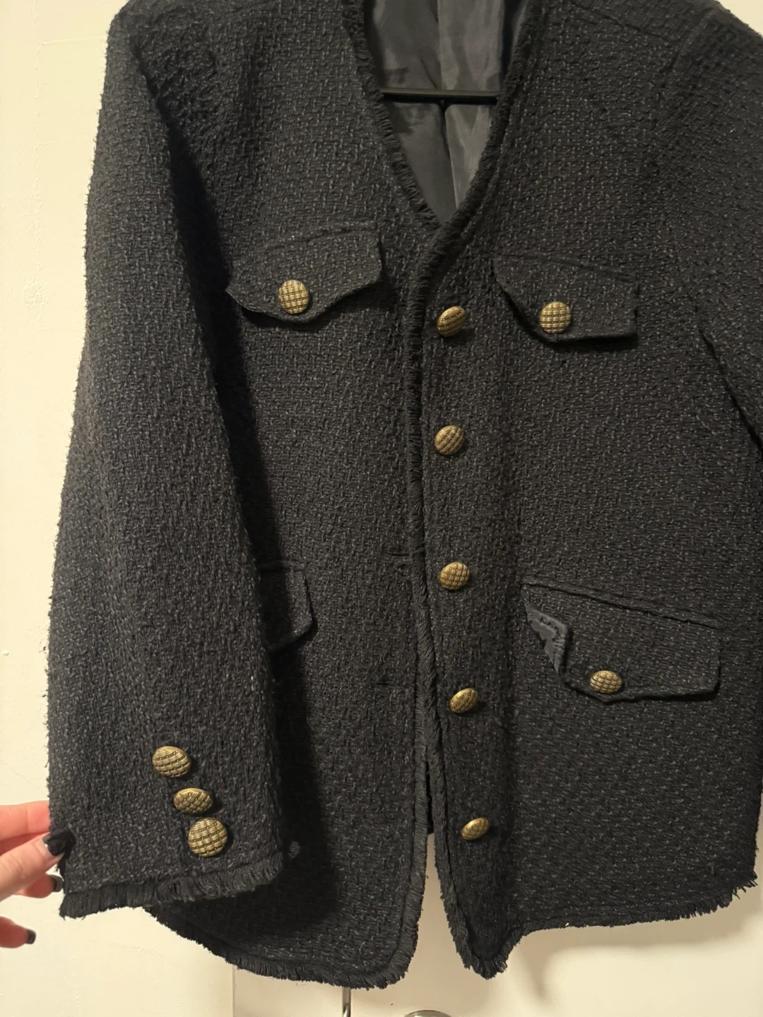 74Selling a stylish black tweed jacket! It has a classic look with gold buttons and front pockets. Perfect for adding a touch of elegance to any outfit.