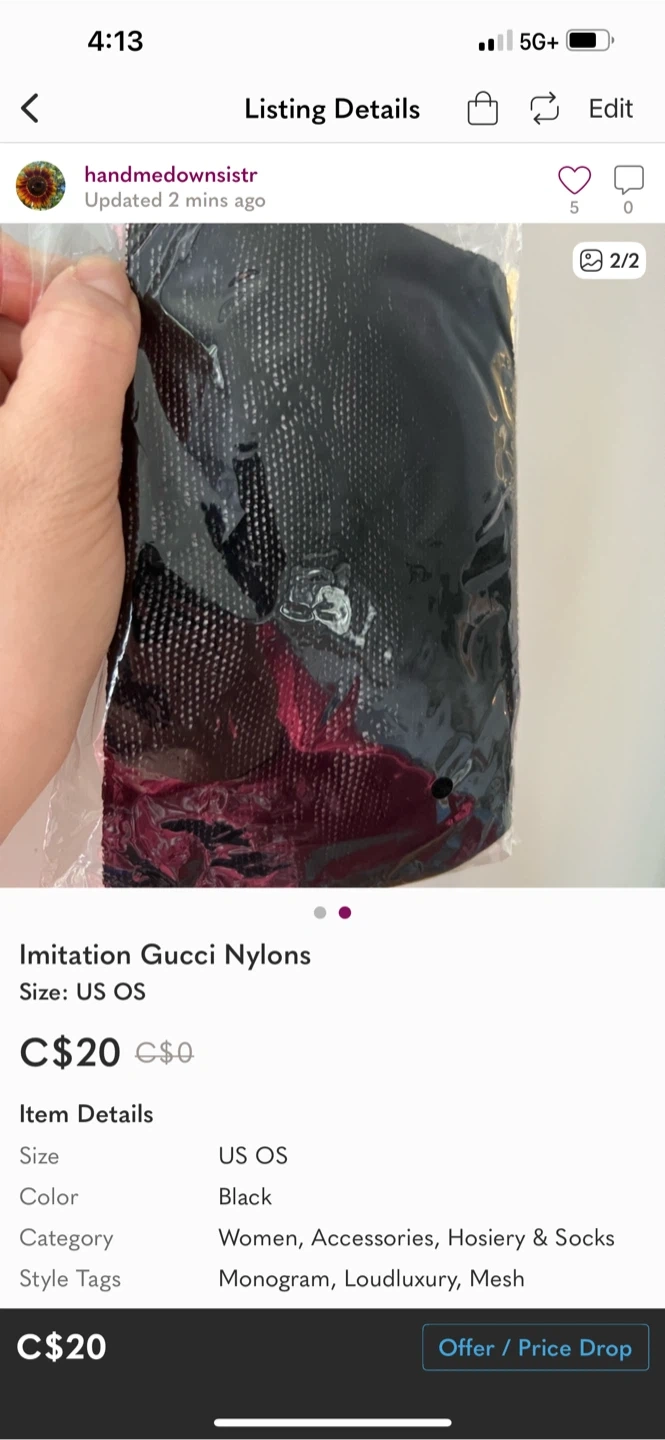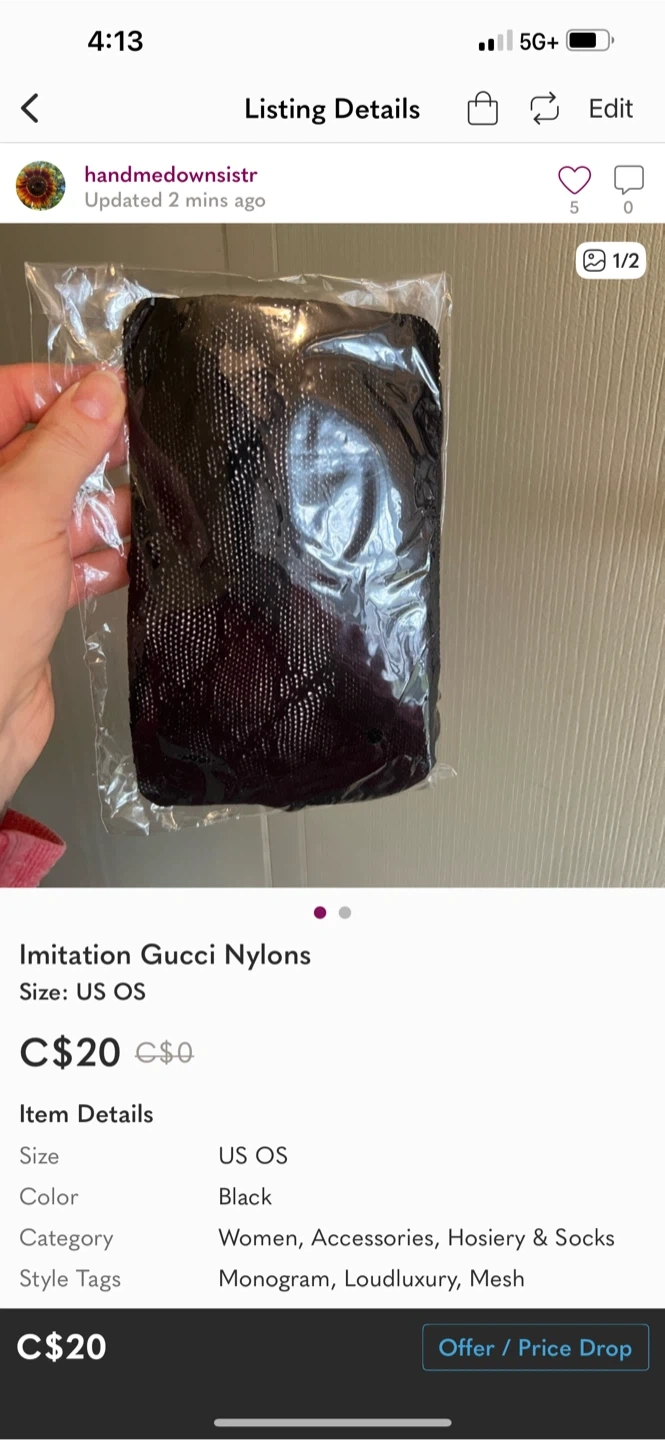 243Selling a pair of imitation Gucci nylons in black, size US OS. They are still in the original packaging