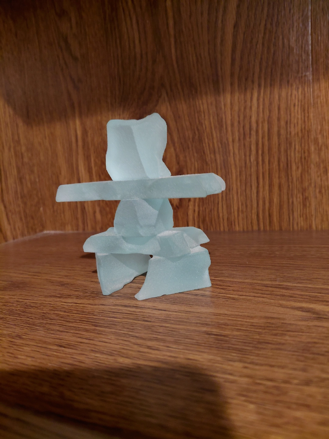 Here's a lovely Inukshuk sculpture, perfect for adding a touch of Canadian charm to your space! It's made of a beautiful light blue material that resembles sea glass. It's a unique piece that would look great on a shelf or desk