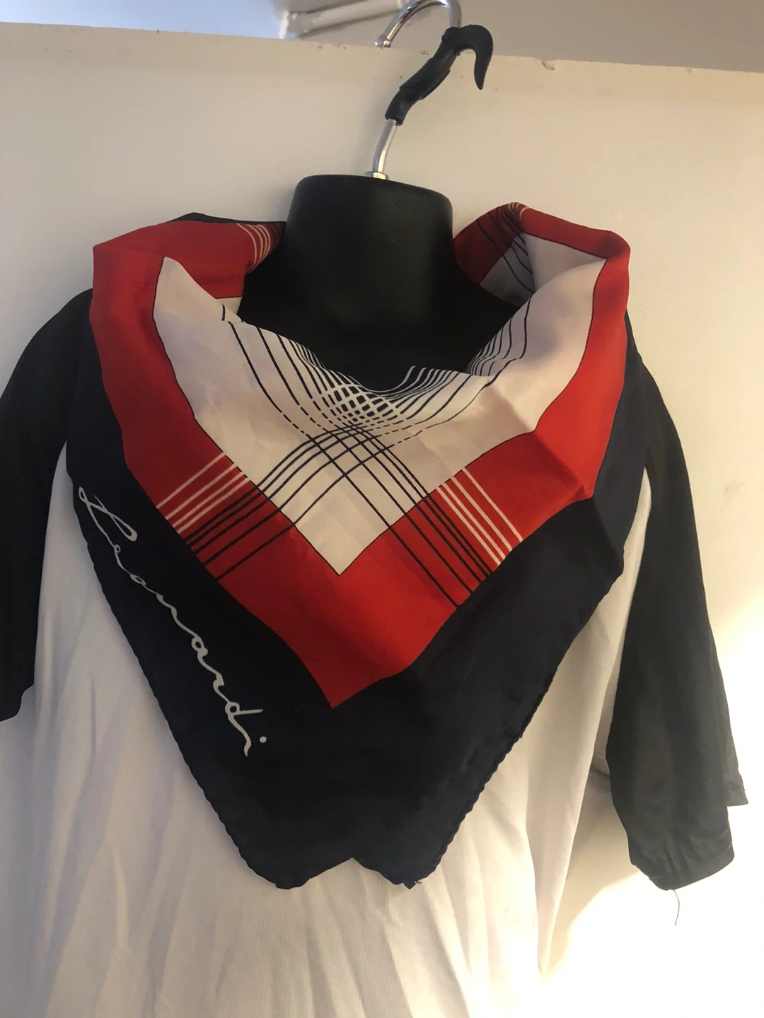 Selling a Leonardi scarf with a cool geometric pattern! The colours are red, white, and navy blue. It's in great condition and would add a pop of colour to any outfit