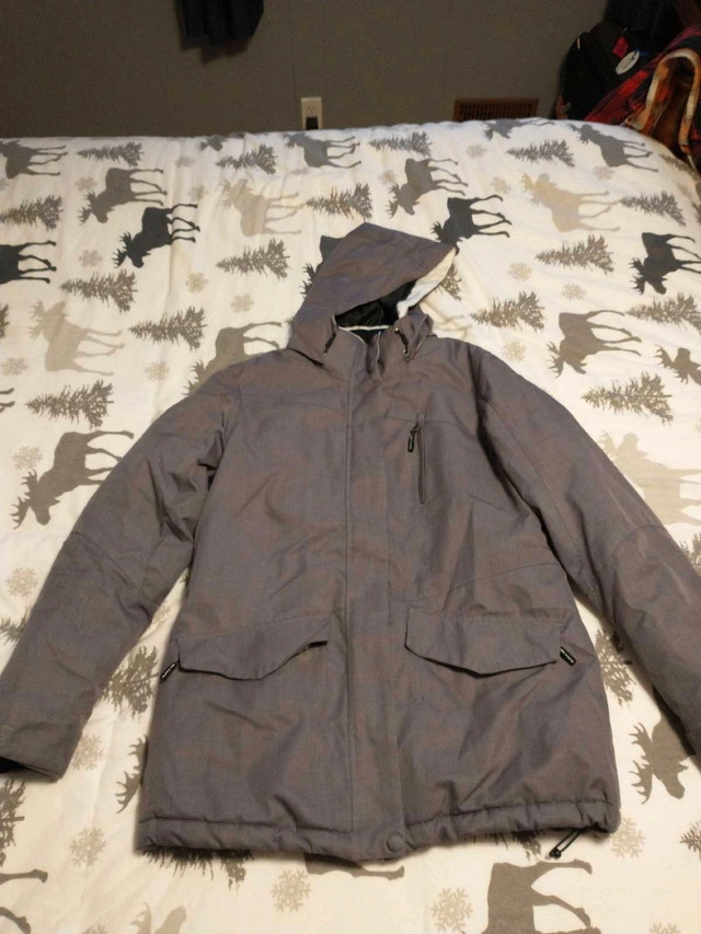 Very warm winter jacket with hood. Light grey. Zippers work. Lots of life left. Mens or womens - size small. Smoke free home. Pick up near Banwell and the Expressway.