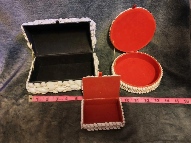 Beautiful shell jewelry or trinket boxes. Some minor imperfections. See pictures for sizing. $10 for all 3. Smoke free home. Pick up near Banwell and the Expressway.