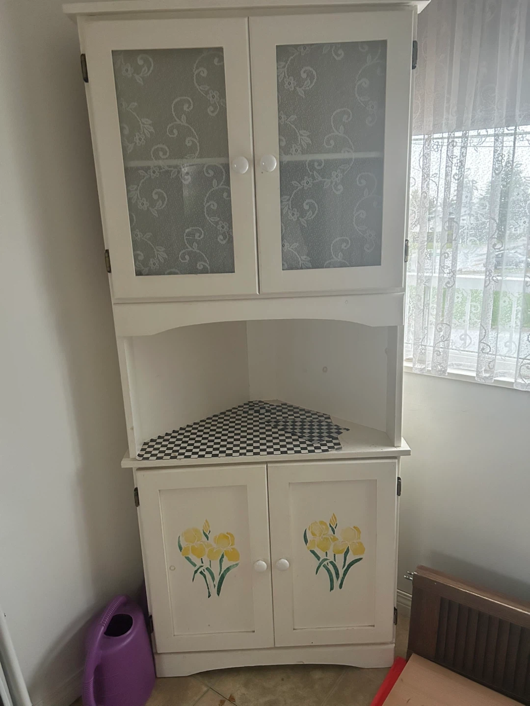 Selling a cute corner cabinet! It's white with floral details on the bottom doors and patterned glass on the top. Perfect for adding some charm to a room. Or a perfect diy project. Pick up only