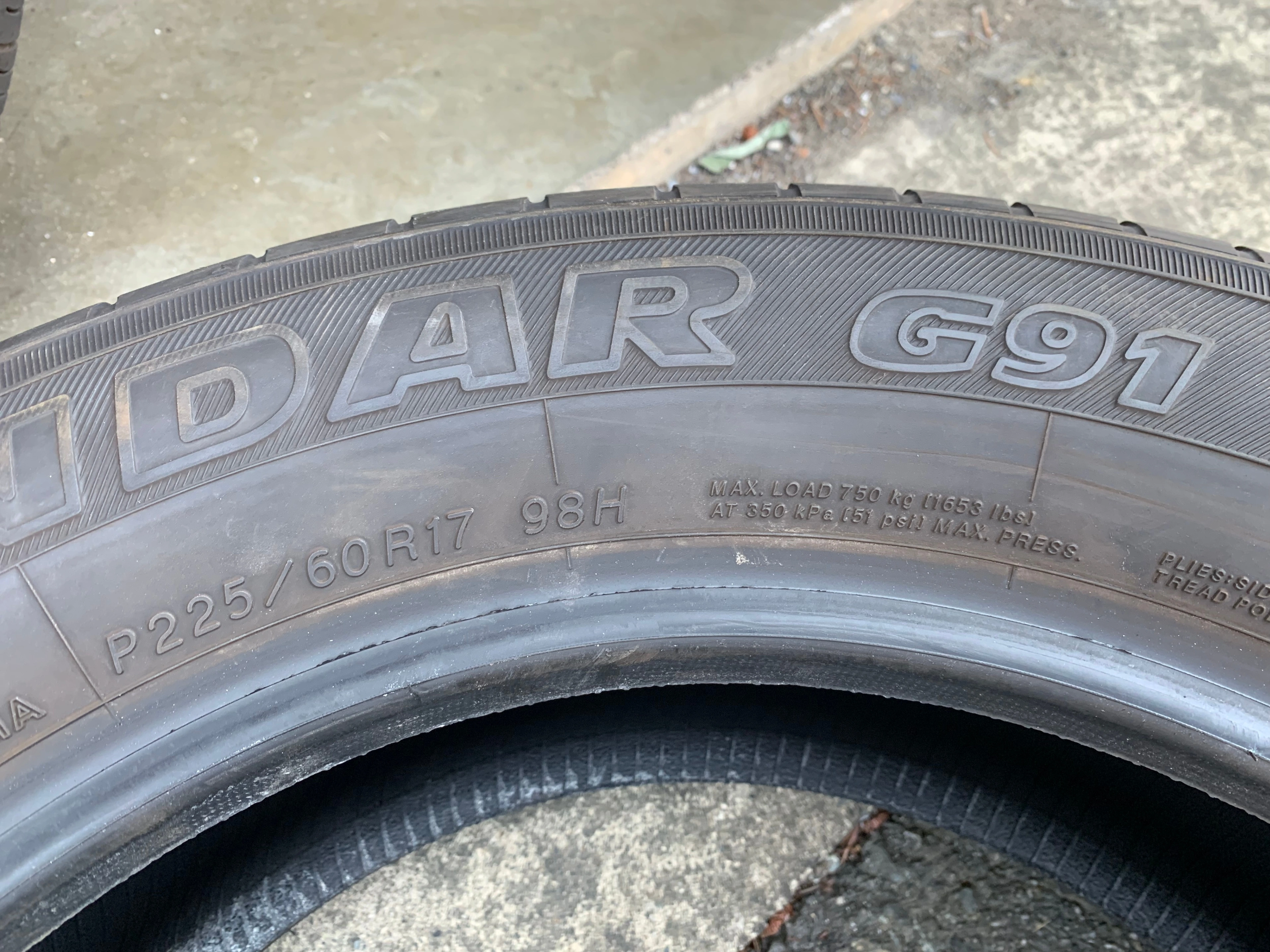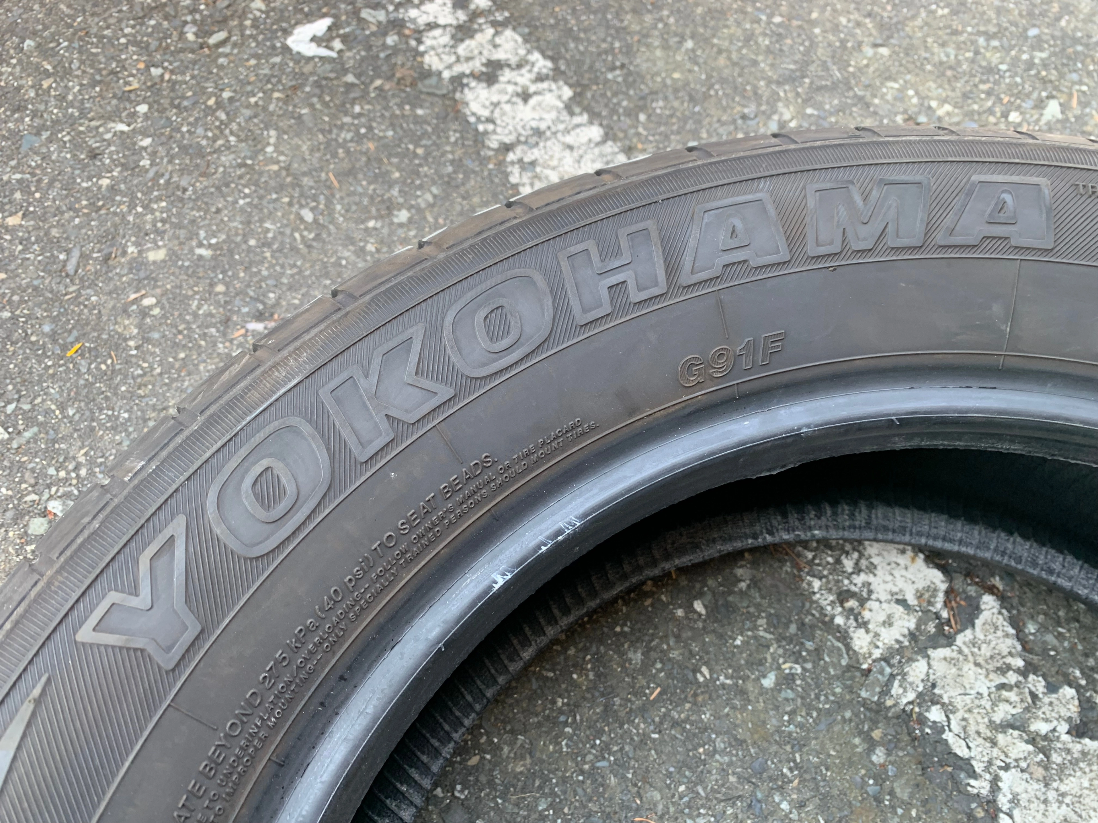 60a nice pair of Yokohama all season Tires in great shape with tons of tread almost like new (2 TIRES ONLY) size 225/60/17 98H M+S Yokohama Geolandar G91F with no repairs and over 95% tread like new come grab the pair for only $320 or pay over $300 Plus Taxes each for new ones huge savings take advantage $$$ come get the bargain $$$ (2 TIRES ONLY) I also have these tires available in the same size if interested:- 1 X 225 60 17 225/60/17 99H Michelin X-Ice 3 with 10/32nds tread like new 1 X 225/60/17 99T M+S Continental conti pro contact Eco Plus np 90% tread 1 x 225/60/17 103H XL M+S Nordman WR SUV np 90% tread 1 X 225/60/17 98H M+S Yokohama Geolandar G91F 1p 80% tread 1 X 225/60/17 98H M+S Yokohama Geolandar G91F np 80% tread 1 x 225/60/17 99H M+S Michelin Cross Climate 2 np 85% tread 1 X 225/60/17 99H M+S Michelin X tour A/S T+H np 70% tread 4 X 225/60/17 99T M+S GT Radial Ice Pro 3 np 85% tread we are located in Surrey BC but can also deliver into vancouver island or anywhere in canada or pickup locally in newton surrey or fleetwood surrey NOTE: Vancouver Island: victoria or nanaimo $15 FLAT RATE delivery charge (PER TIRE) if I have enough appointments booked to justify the trip cost to come over. leave ph no and Ill get you a date for expected delivery with this option. otherwise i can get you a shipping quote but will need a full ship to address.