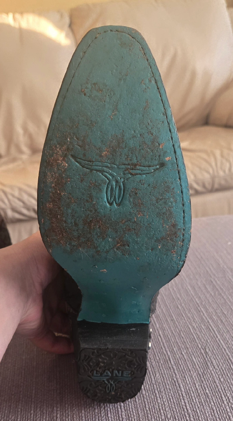 Selling a pair of Lane Women's Kimmie Western Boots, model LB0244C. They feature a beautiful design with distressed black leather and brown accents. These boots have a unique style with decorative studs. Originally bought for $570.07 only worn 2 times