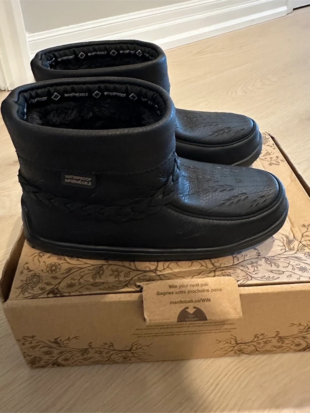 $60-Manitobah Mukluks Tamarack Waterproof leather boots size 6 in black original box. These boots are perfect for keeping your feet warm and dry during the winter . Featuring a sheepskin-lined footbed that'll keep you cozy in frosty conditions up to 30 degrees below zero. If u are a size 7 these will fit