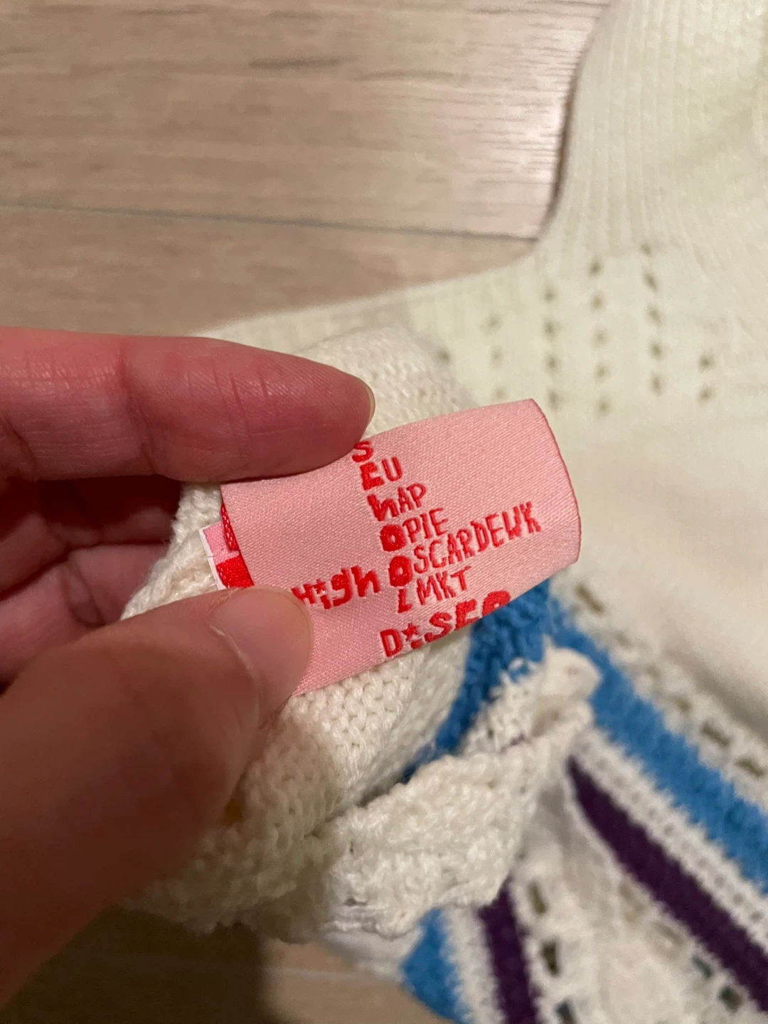 Cute knit top from High Scardeyk MKT! It's a size small and features a unique design with blue and purple stripes near the bottom