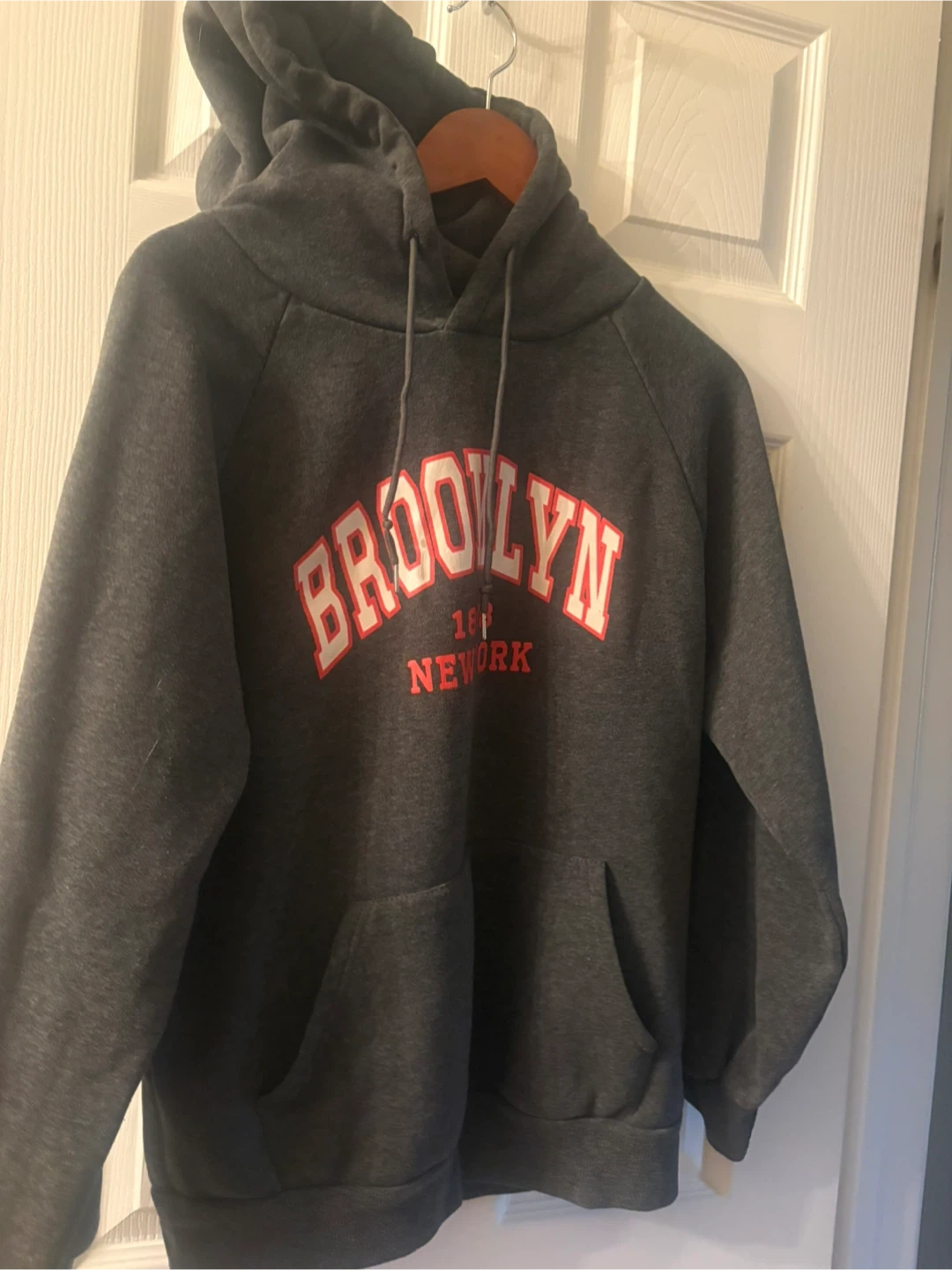 Selling a grey hoodie with "Brooklyn New York" in red and white lettering on the front. It has a hood and a front pocket. Perfect for staying cozy!
