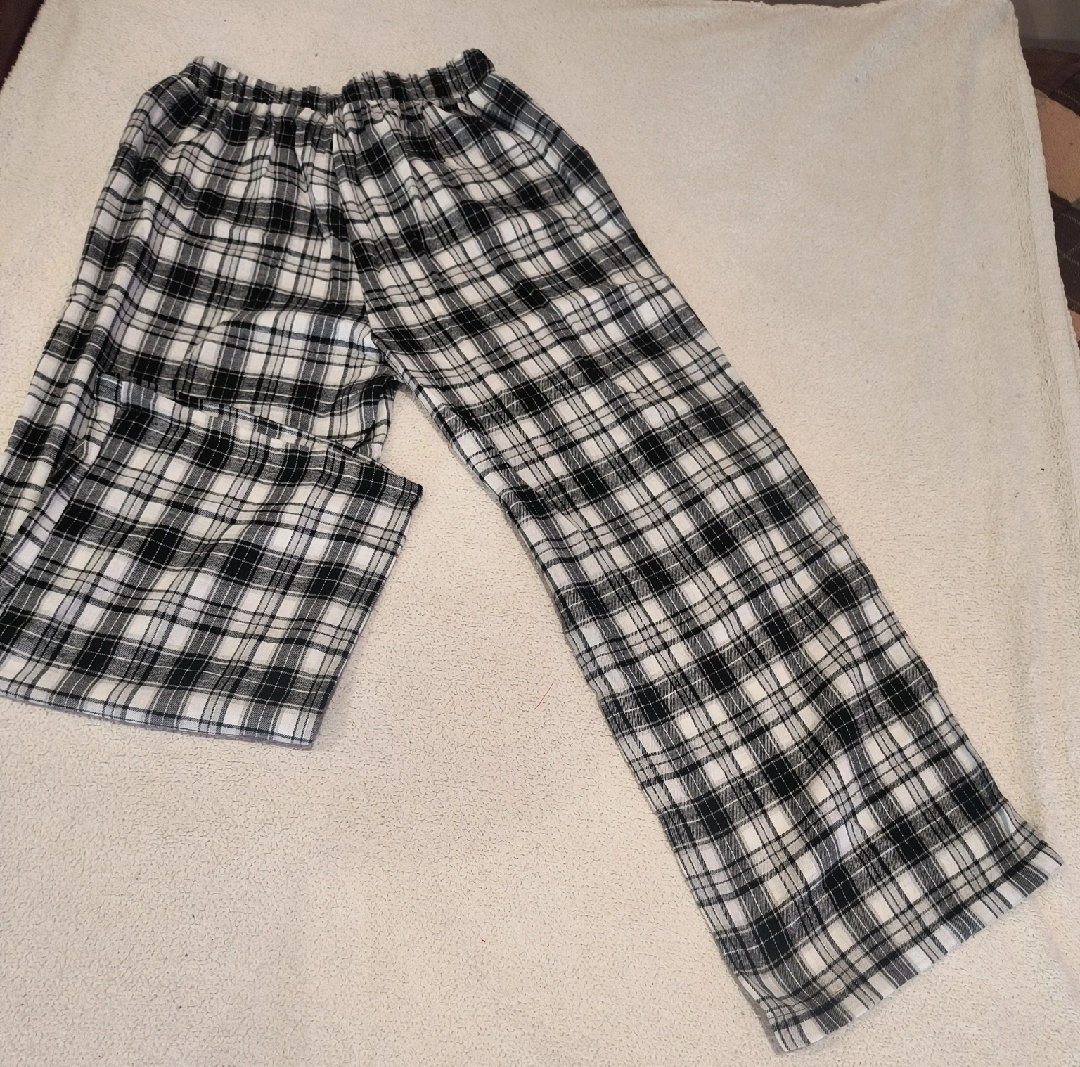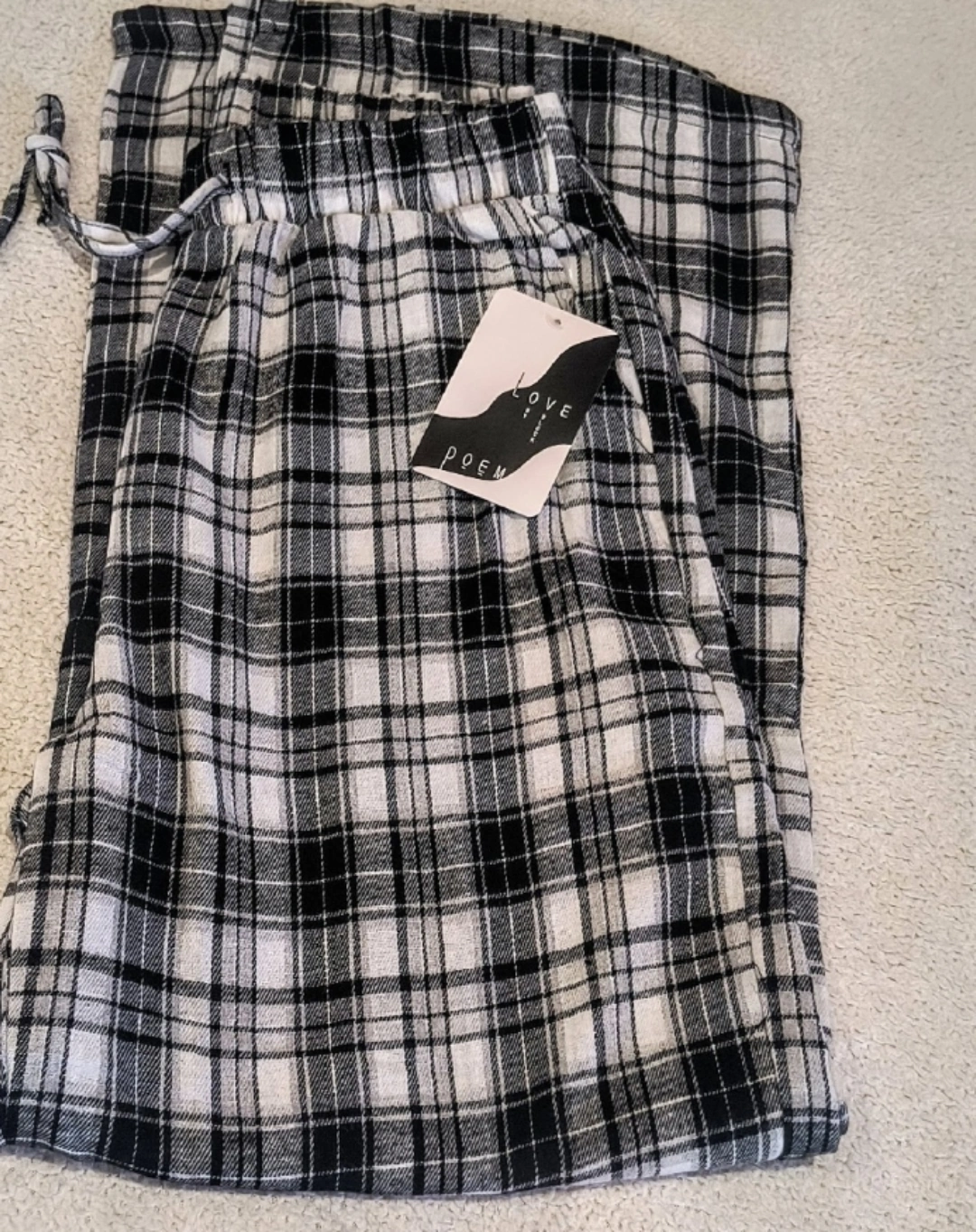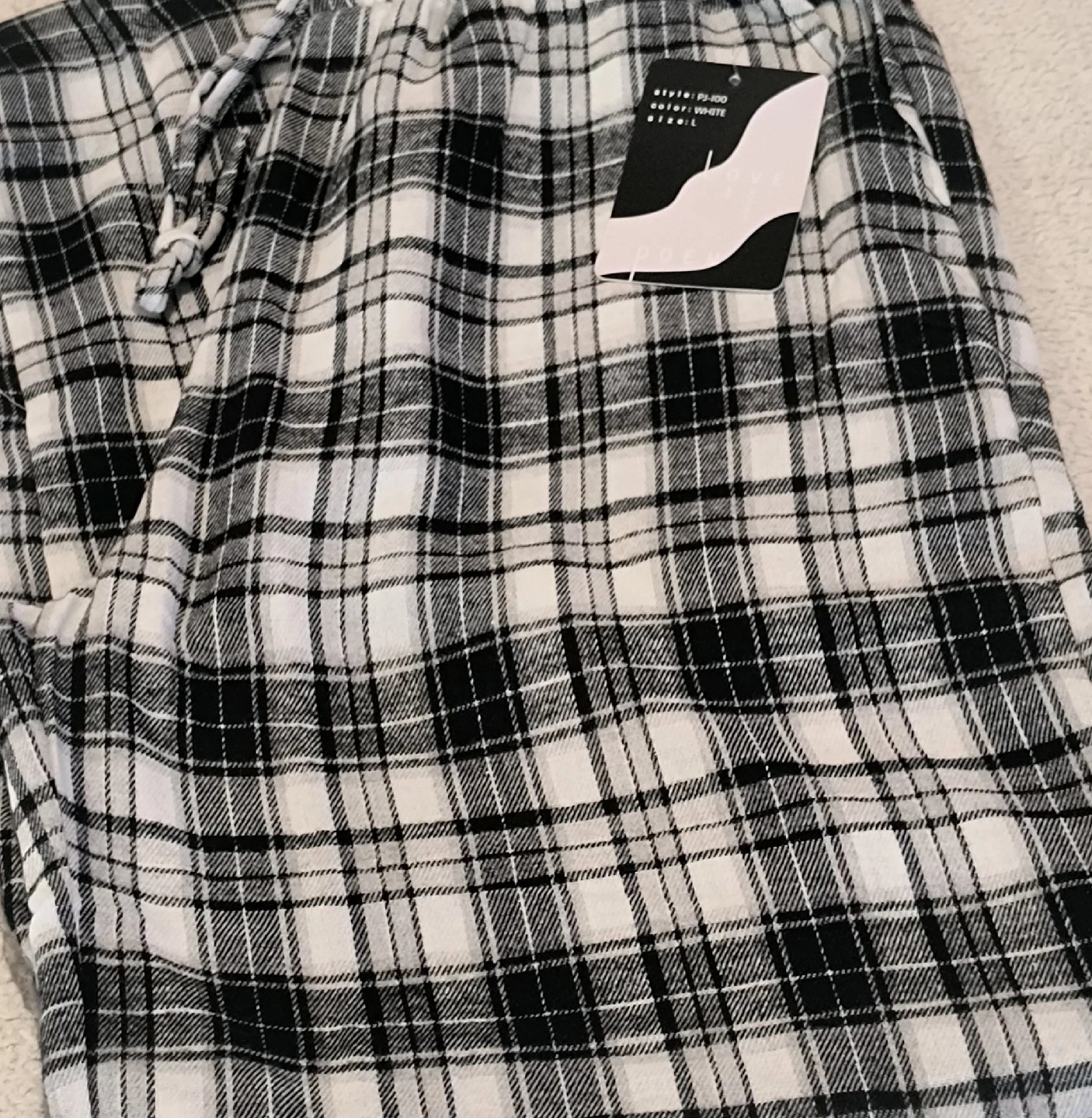 Cozy up with these Love Poem pajama pants! They feature a classic black and white plaid pattern. The size is L. These are perfect for lounging around the house or getting a good night's sleep