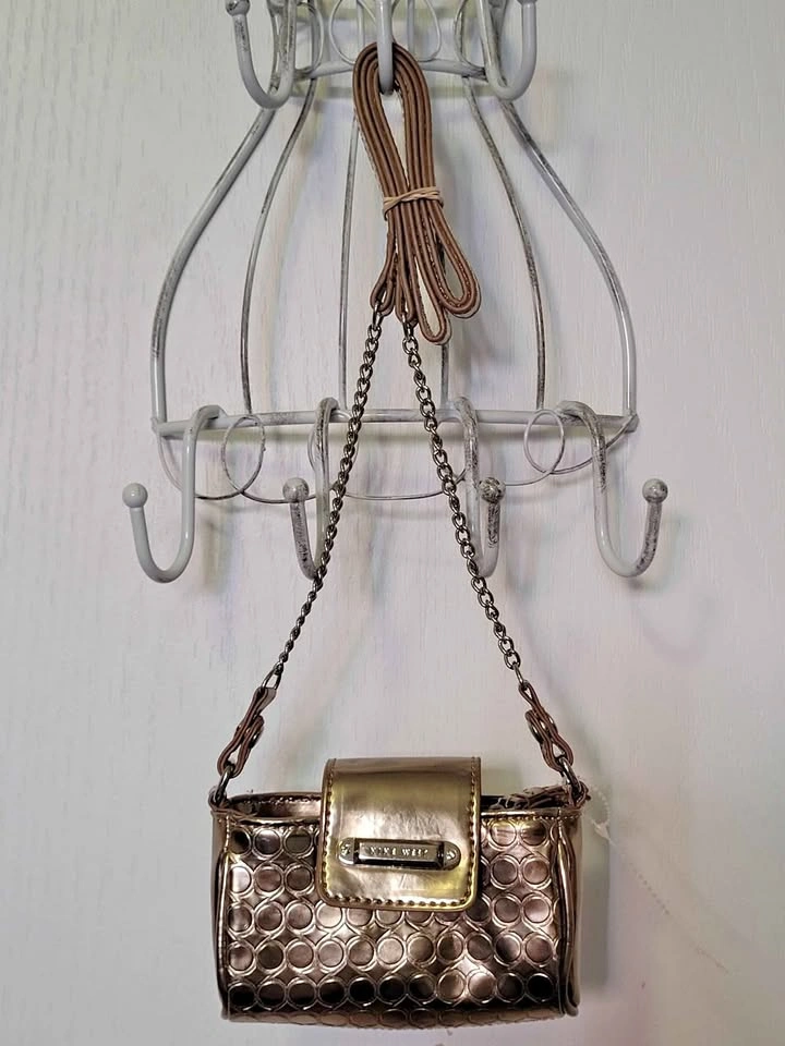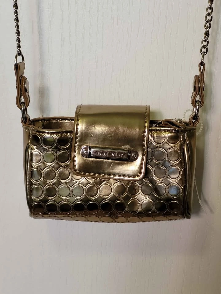 New clutch, approximately the size of a woman's hand. Nine West, in a shimmery gold. Interior large enough to hold the basics for a night out.