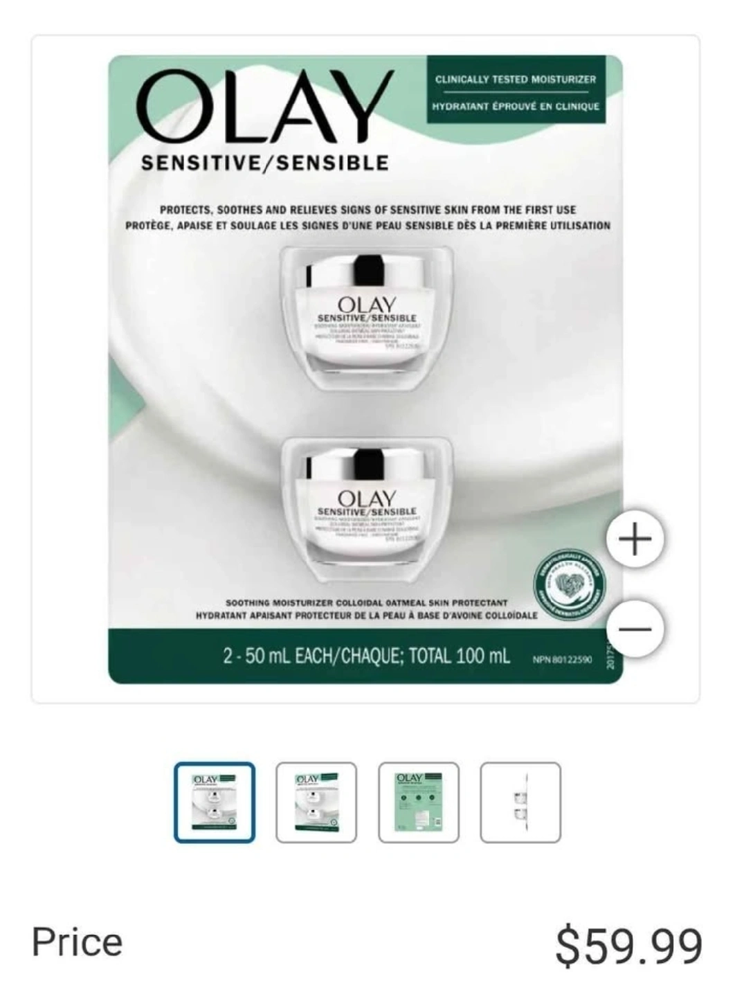 Selling a pack of Olay Sensitive/Sensible moisturizer. Each jar contains 50mL, for a total of 100mL. This clinically tested moisturizer protects, soothes, and relieves signs of sensitive skin. It's a soothing moisturizer with colloidal oatmeal skin protectant. Originally bought for $59.99