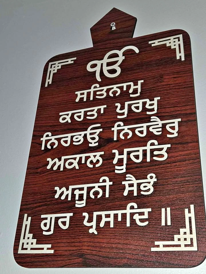Beautifully crafted wooden wall plaque featuring Ik Onkar and the Mool Mantar (Sikh sacred verse) in Punjabi script. Perfect for your home, office, or prayer room, bringing divine energy and peace to any space. Made from high-quality wood with engraved golden letters. Elegant and spiritual Sikh design. Easy to hang on wall. Ideal gift for housewarming, Diwali , Vaisakhi, or spiritual occasions.
