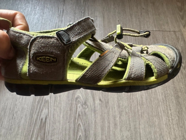 These are a pair of used Keen sandals, perfect for active kids, size 4 US, with a secure fit and durable construction. They have been worn, so they have some wear, but they're still ready for more adventures.