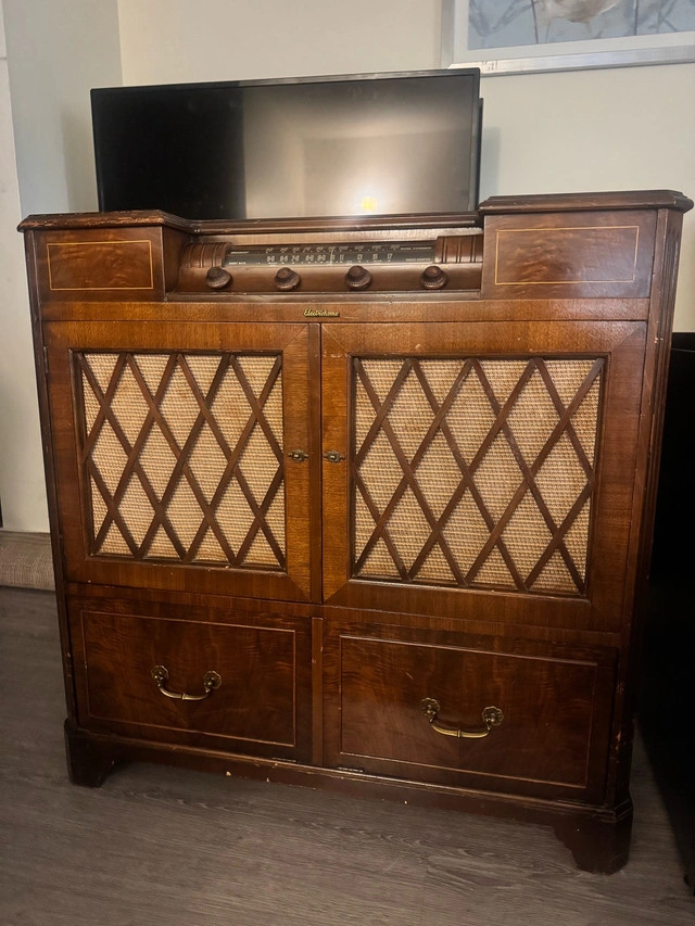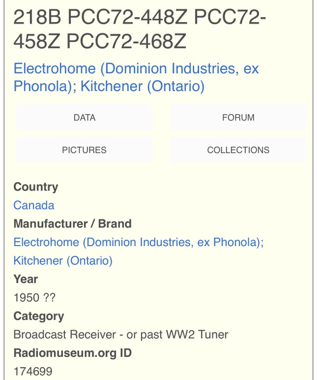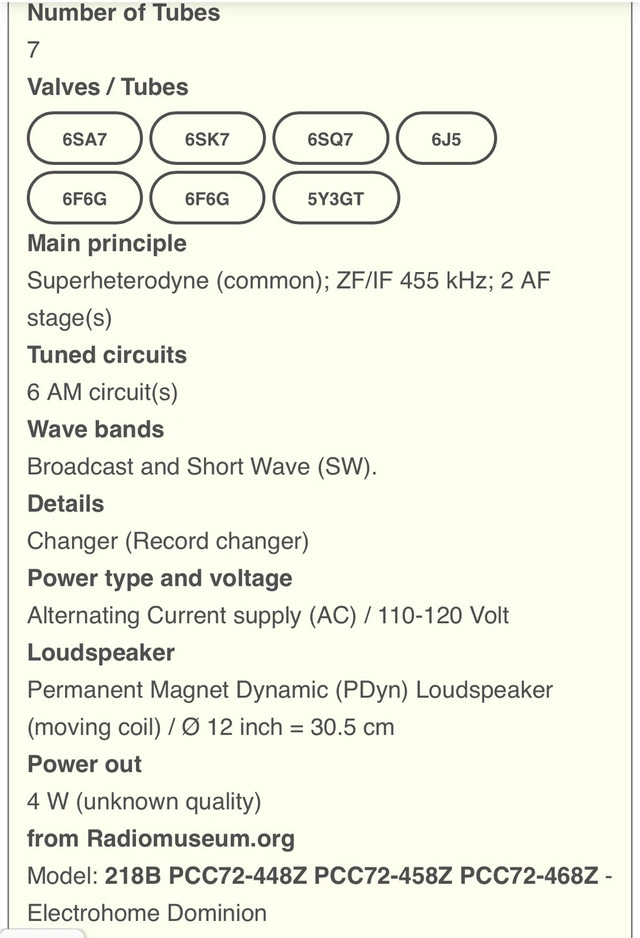 Step back in time with this charming Electrohome vintage radio, a beautiful piece of history with a model number of 218B PCC72-448Z PCC72-458Z PCC72-468Z! This radio features both Broadcast and Short Wave (SW) bands, offering a wide range of listening options. Inside, it boasts 7 tubes, including 6SA7, 6SK7, 6SQ7, and more, ensuring that warm, classic sound. Specifications: * Brand: Electrohome (Dominion Industries, ex Phonola) * Model: 218B PCC72-448Z PCC72-458Z PCC72-468Z * Year: Approximately 1950 * Category: Broadcast Receiver - or past WW2 Tuner * Tuned Circuits: 6 AM circuit(s) * Wave Bands: Broadcast and Short Wave (SW). * Power Type: Alternating Current supply (AC) / 110-120 Volt * Loudspeaker: Permanent Magnet Dynamic (PDyn) Loudspeaker (moving coil) / Ø 12 inch = 30.5 cm * Power Out: 4 W (unknown quality) This radio has been a beloved item. Needs fine tune repair. Imagine the stories it could tell! Since pricing data for this specific model is difficult to find, Don't miss the chance to own a piece of radio history! Please note, if the ad is still up, the radio is still available. Asking $300 obo
