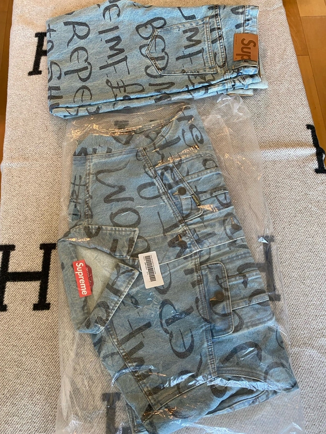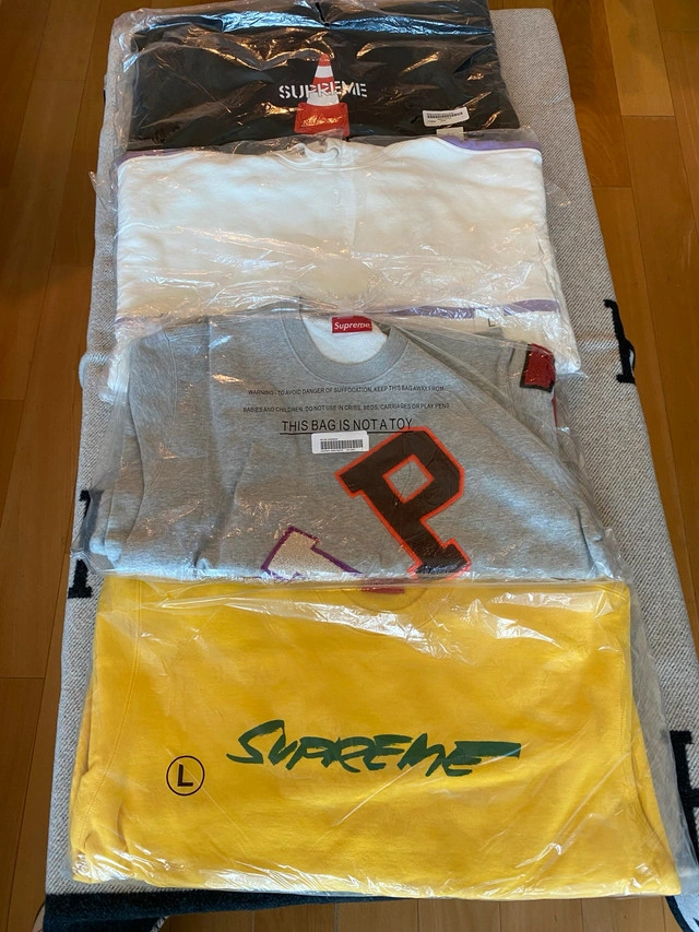 66Selling brand new SUPREME HOODIES SWEATSHIRTS, all in brand new in sealed unworn condition. Cash deal, self pick up in Markham. SUPREME FUTURA LOGO CREWNECK FW20 YELLOW LARGE $200 SUPREME BIG ARC CREWNECK FW20 GREY LARGE $300 SUPREME CONE HOODED SWEATSHIRT BLACK LARGE FW19 $220 SUPREME BLACK ARK DEMIN TRUCKER JACKET BLUE LARGE $400 SUPREME BLACK ARK JEAN BLUE FW20 WAIST US 32 FOR $400