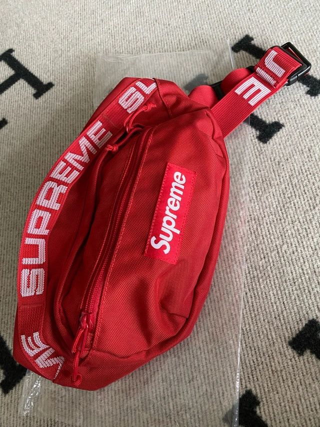 66Get your hands on this brand new Supreme SS18 waist bag in red, a stylish and functional accessory. This sought-after waist bag features the iconic Supreme branding, perfect for streetwear enthusiasts. * Brand: Supreme * Model: SS18 Waist Bag * Colour: Red * Condition: Brand New with original packaging Sealed Looking to add a pop of colour to your fit? This Supreme waist bag is your perfect go-to piece! If the ad's still up, the bag's still available, so don't miss out!