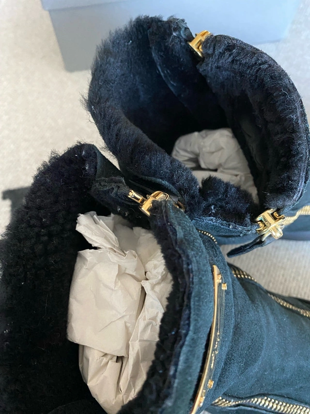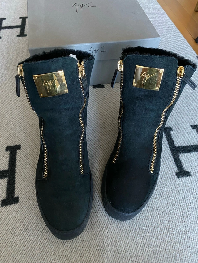 66Elevate your style with these Giuseppe Zanotti GZ leather sneakers in size 42, showcasing a sleek black design with distinctive gold zipper accents. These boots are in excellent used condition, having been gently worn and well-maintained. Original Box Included. Key features include: * Premium black leather with shearling lining inside. * Gold zipper detailing * Comfortable fit (size 42) * Unique Giuseppe Zanotti design. Made in Italy Looking at similar listings, comparable sneakers are typically priced between $300 and $500. Given the excellent condition of these boots, I'm asking $250. If this ad is still up, it's available! Don't miss out on adding these stylish sneakers to your collection.