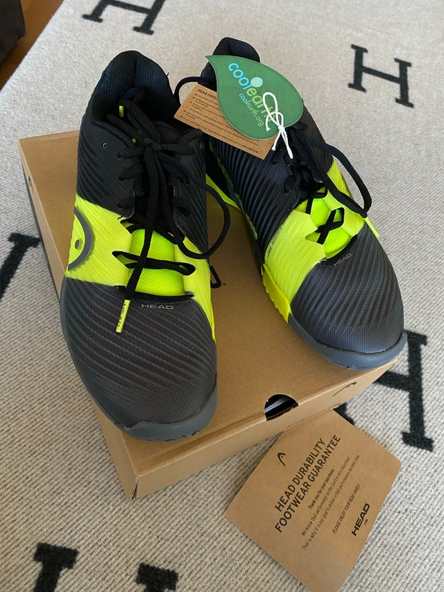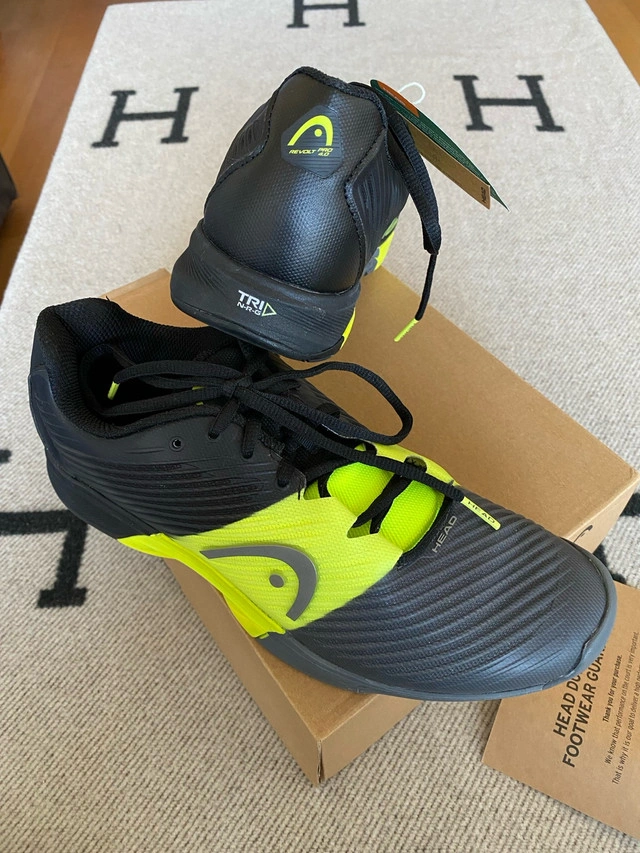 Just wore once. Like new condition. Get ready to dominate the court with these brand new Head Revolt Pro 4.0 tennis shoes in size US9! These stylish black and yellow shoes are designed for performance and durability. Specifications: * Brand: Head * Model: Revolt Pro 4.0 * Size: US9 * Colour: Black/Yellow * Condition: Like New with box If the ad is up, the shoes are available!