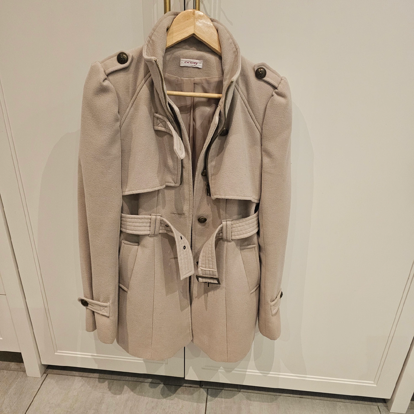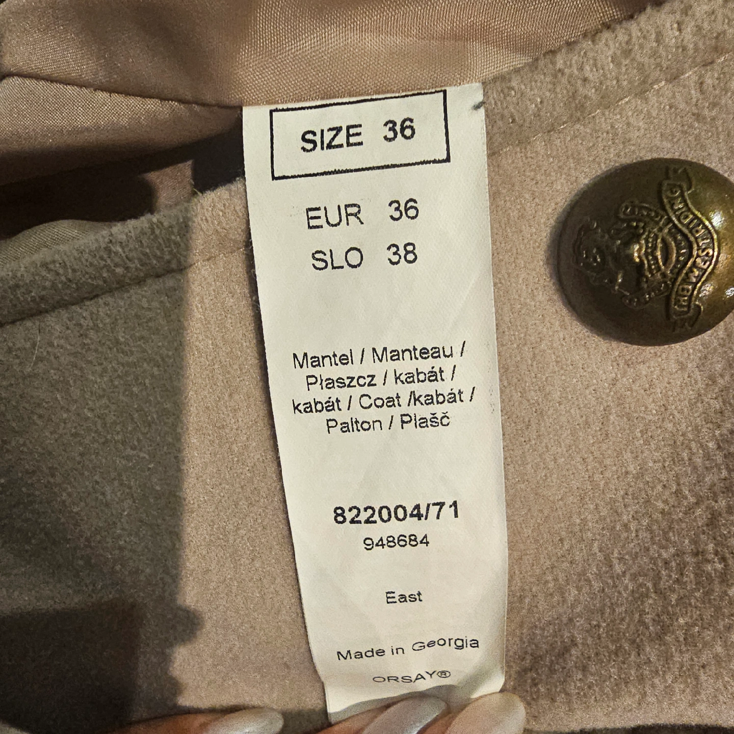 41Selling a beige Orsay coat in size 36 (EUR). It's in great condition and ready for a new home! The coat features a stylish design with a belted waist and button details. Perfect for fall or spring weather!