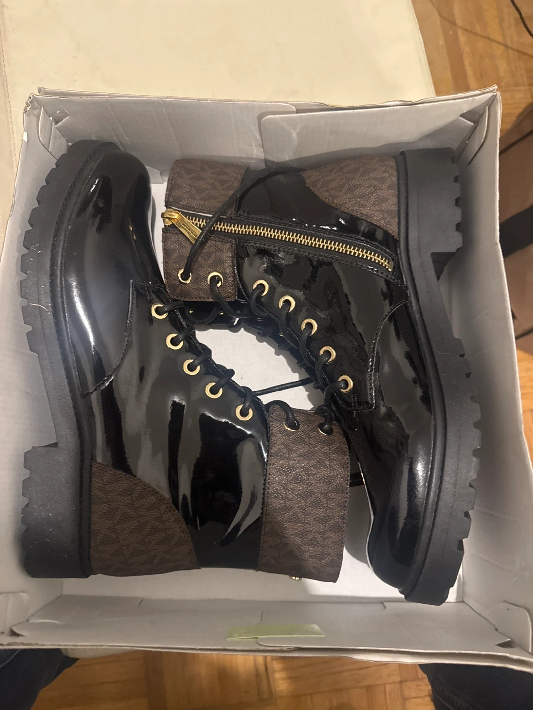 These are a pair of Michael Kors boots in black patent leather! They feature a lace-up front and a side zipper for easy wear. The boots come with their original box.