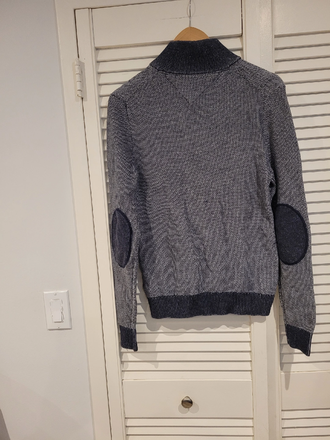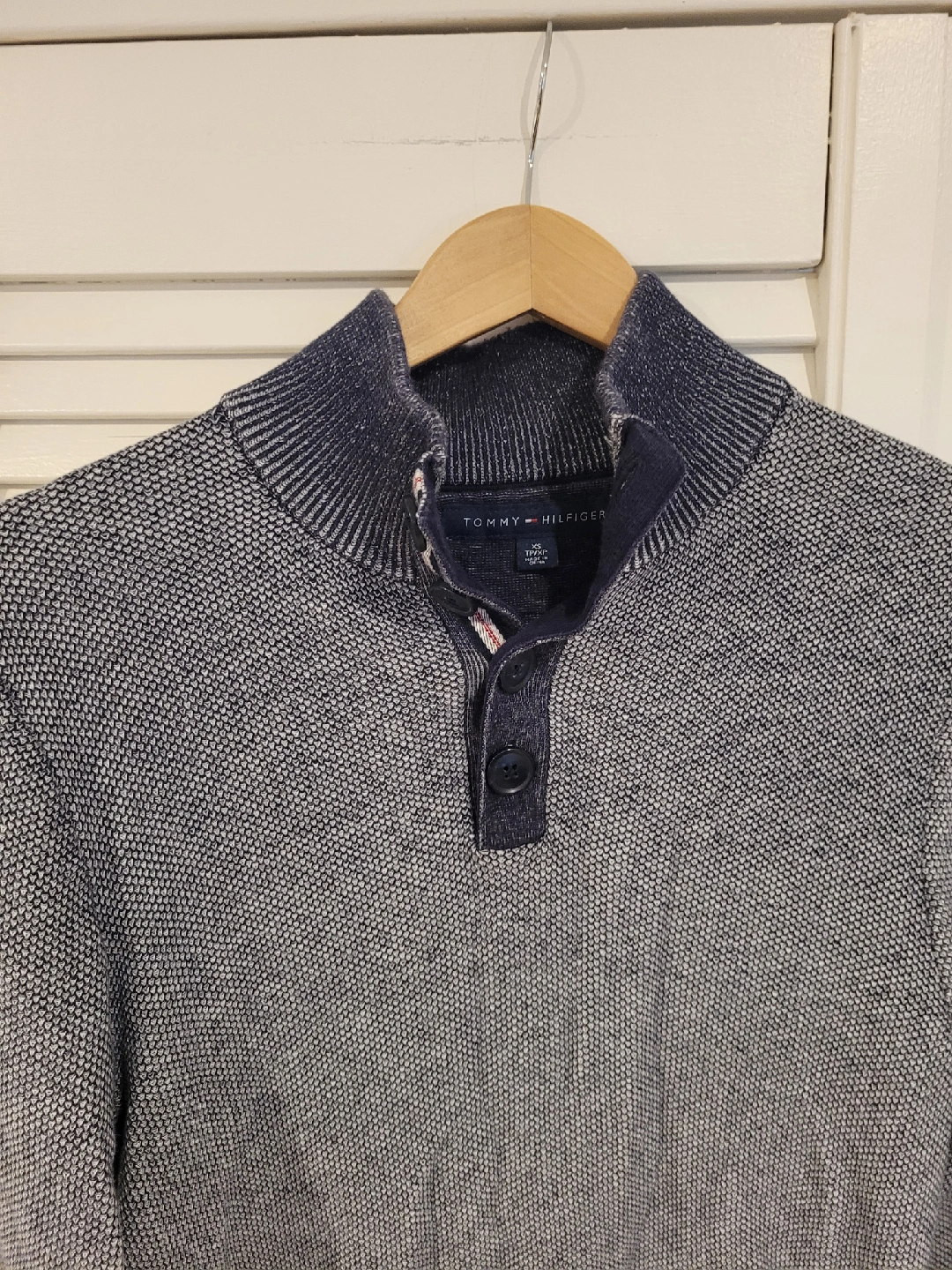Tommy Hilfiger sweater in great condition. It features a button-up collar and stylish elbow patches. Perfect for layering or wearing on its own!
