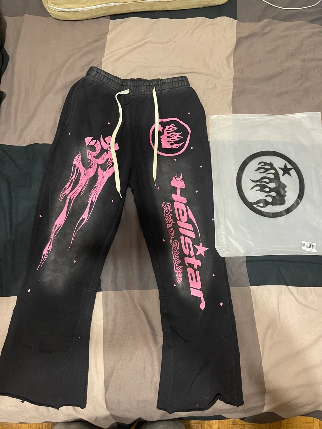 23Selling a pair of Hellstar "Path to Paradise" sweatpants in black. They feature a unique design with pink graphics and come with the original packaging. Perfect for adding a stylish edge to your wardrobe!