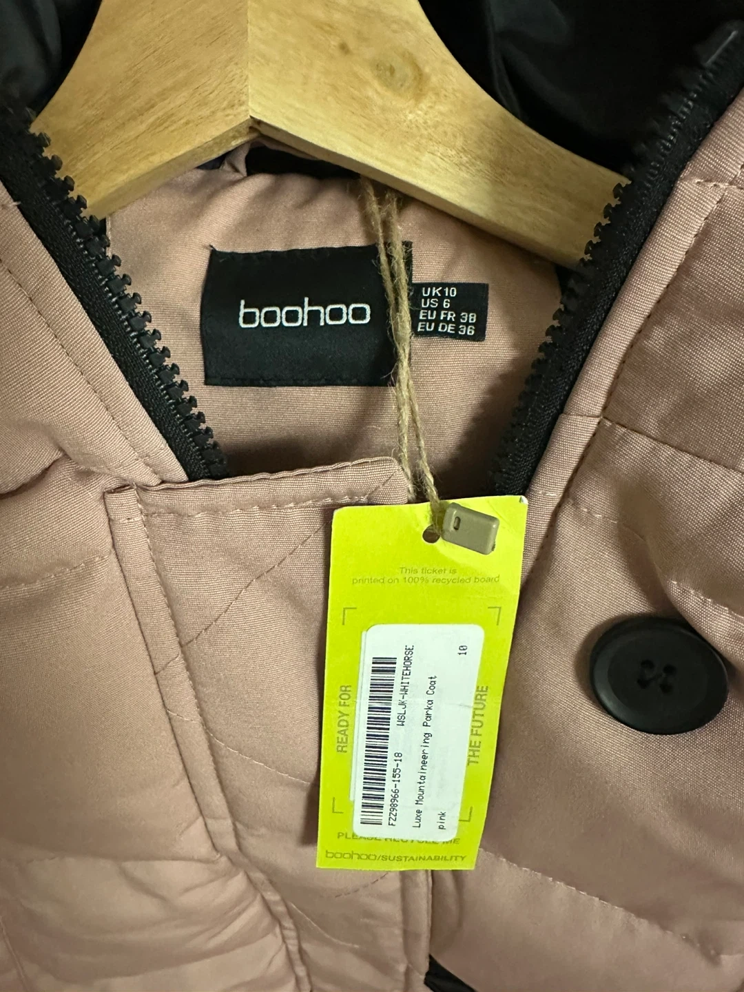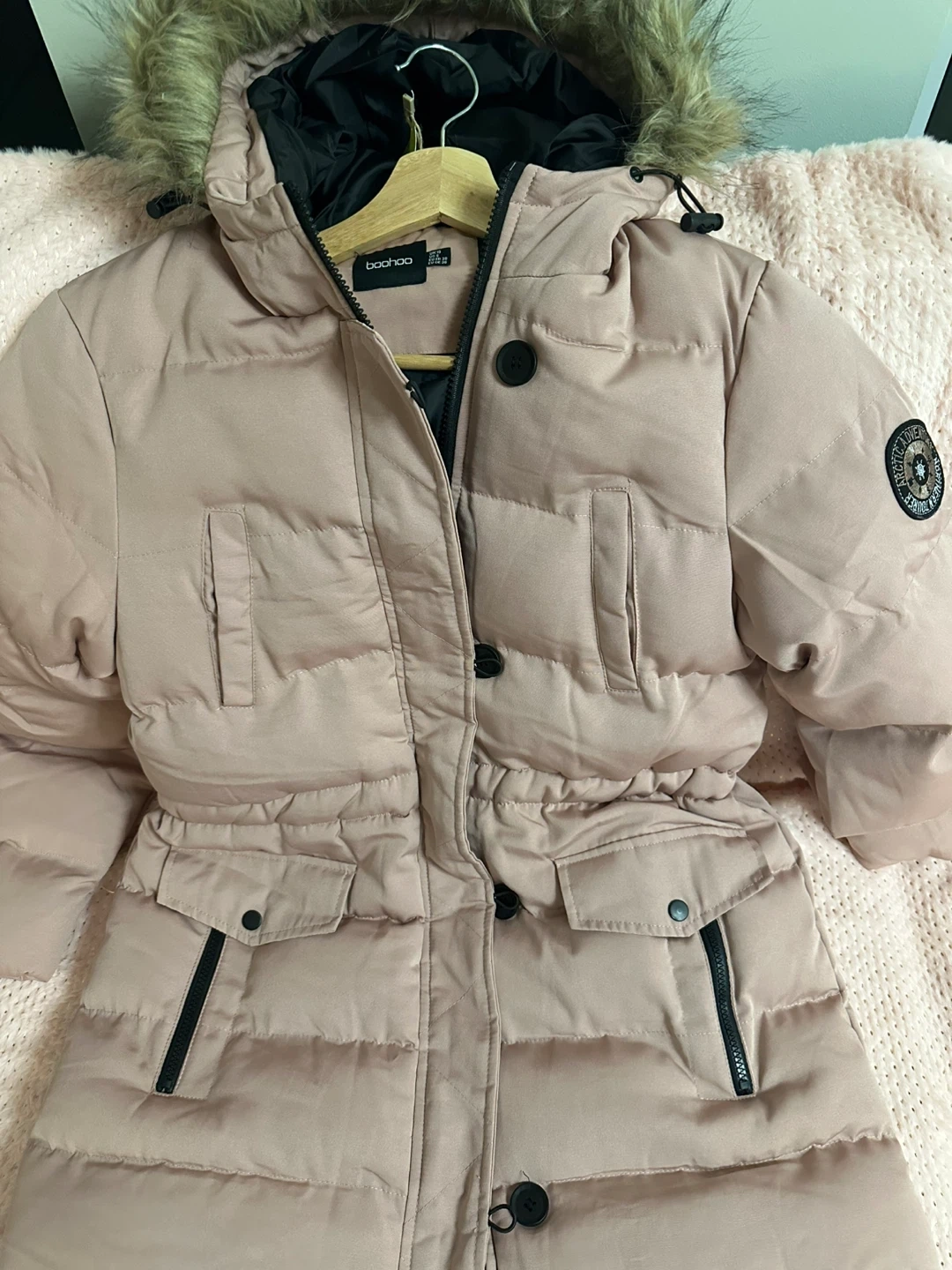 Selling a Boohoo puffer coat in excellent condition! It's a size US 6 and features a faux fur hood. The coat is a lovely light pink colour, perfect for staying warm this winter. It has a drawstring waist and several pockets for convenience