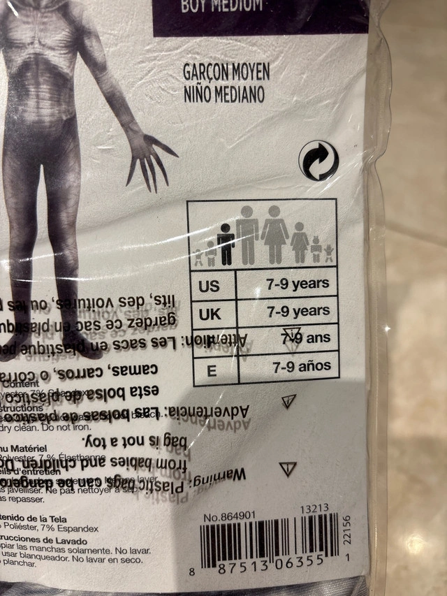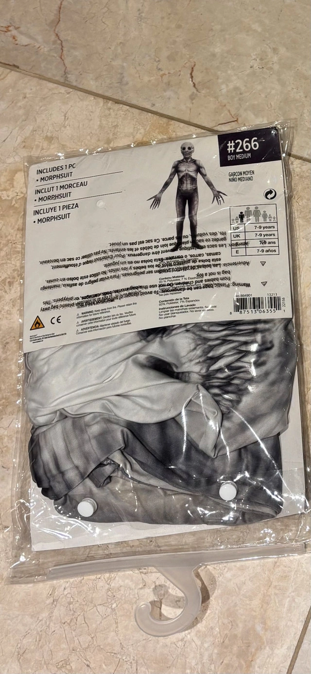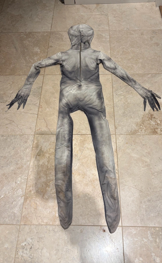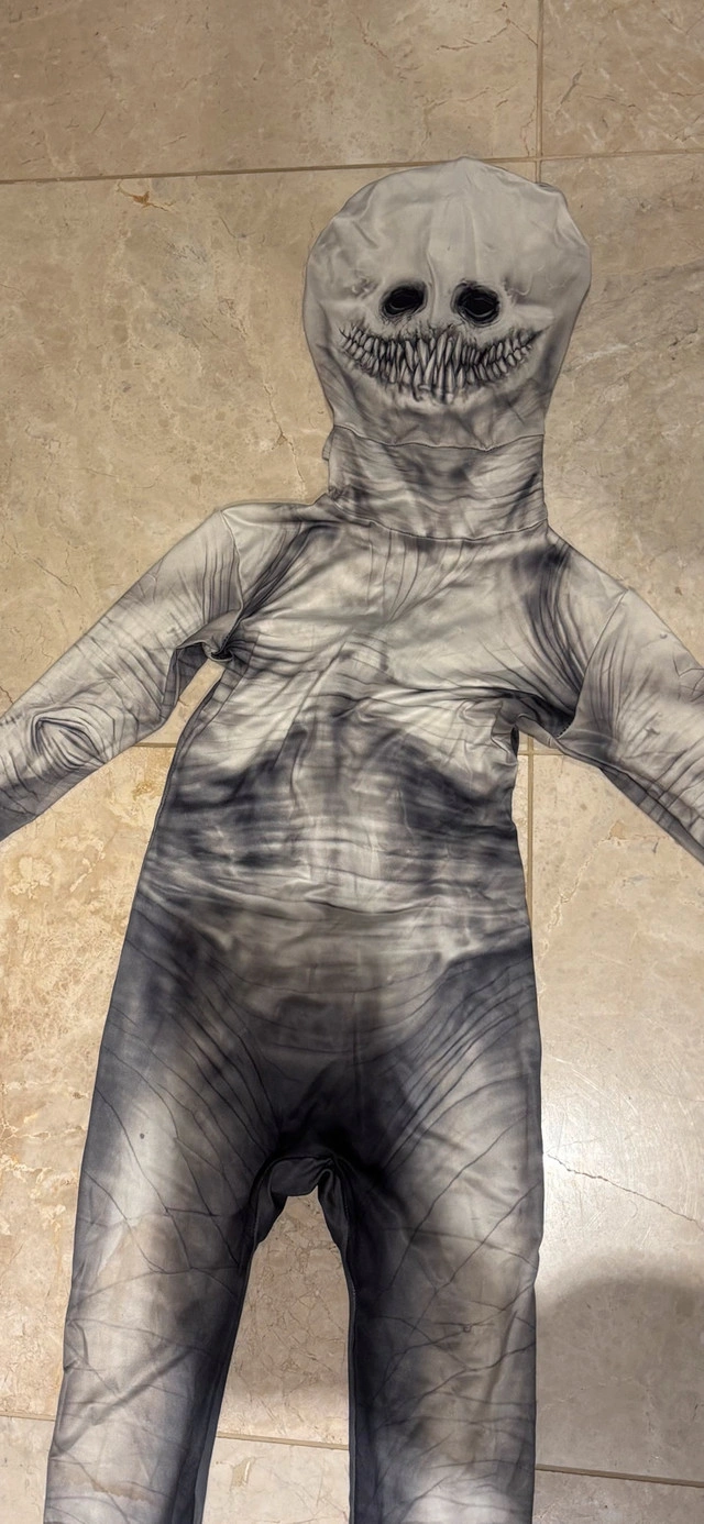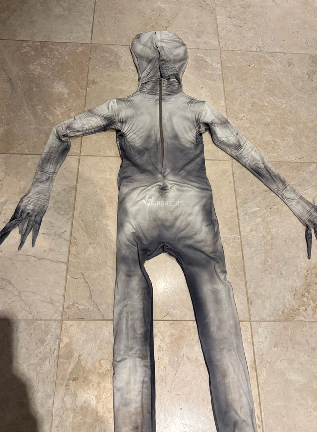 28“The Rake” Morphsuit Halloween costume. It’s one piece. Has a zipper on the back and the attached mask part closes with velcro on the back. Quite stretchy. Worn only the one time. Size Boy’s Medium (7-9 years) * other costumes available as well! Checkout my other posts *