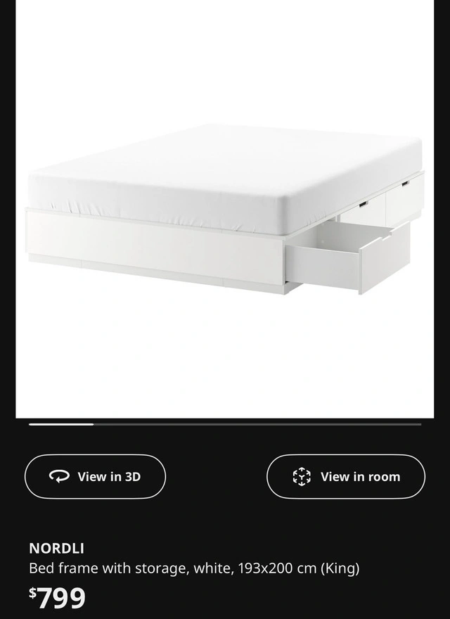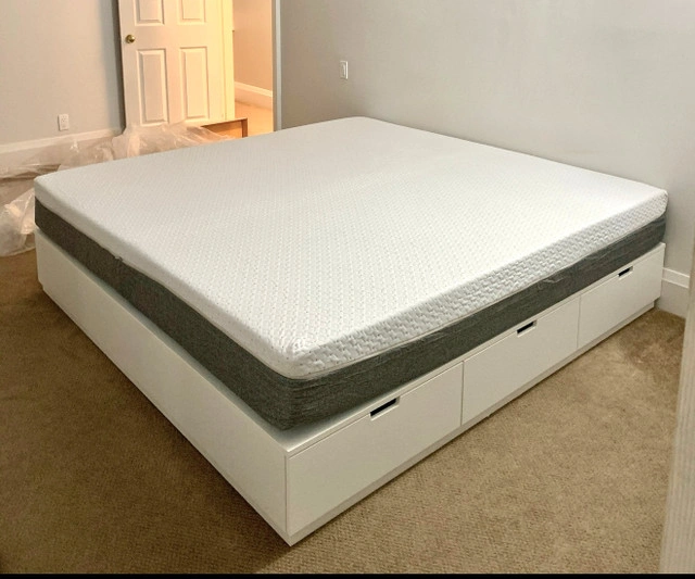 Ikea Nordli King Bed Frame in white with 6 storage drawers (3 on each side). High quality drawers are deep and roll smoothly. Excellent condition, no damage. Includes slats for mattress. Endy king mattress and headboard also available - discount if you buy more. Pick up in Stouffville. For Sale By: Owner