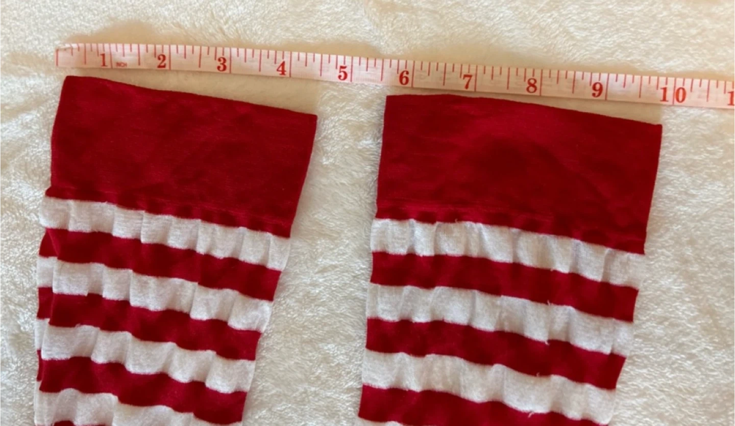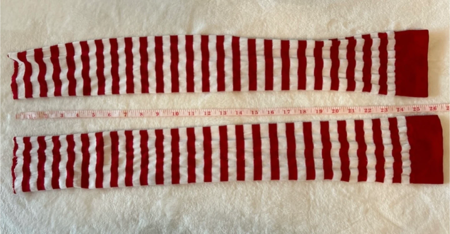 123Here are some cute red and white striped thigh high socks! They are approximately 26 inches long and the top band is about 9.5 inches wide. Perfect for adding a fun touch to any outfit! Stretch and thick nylon material