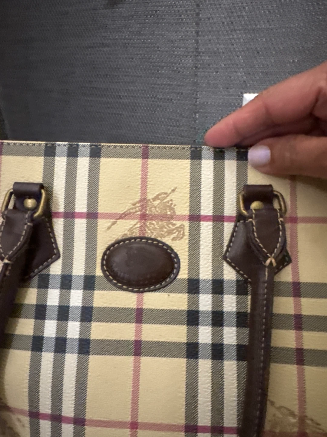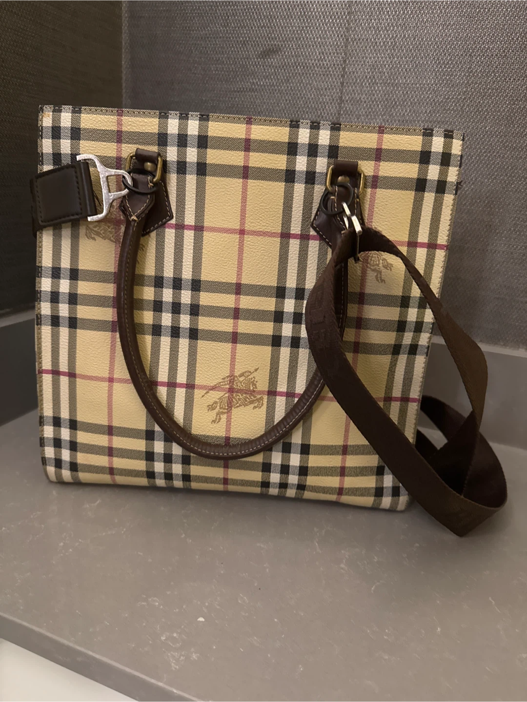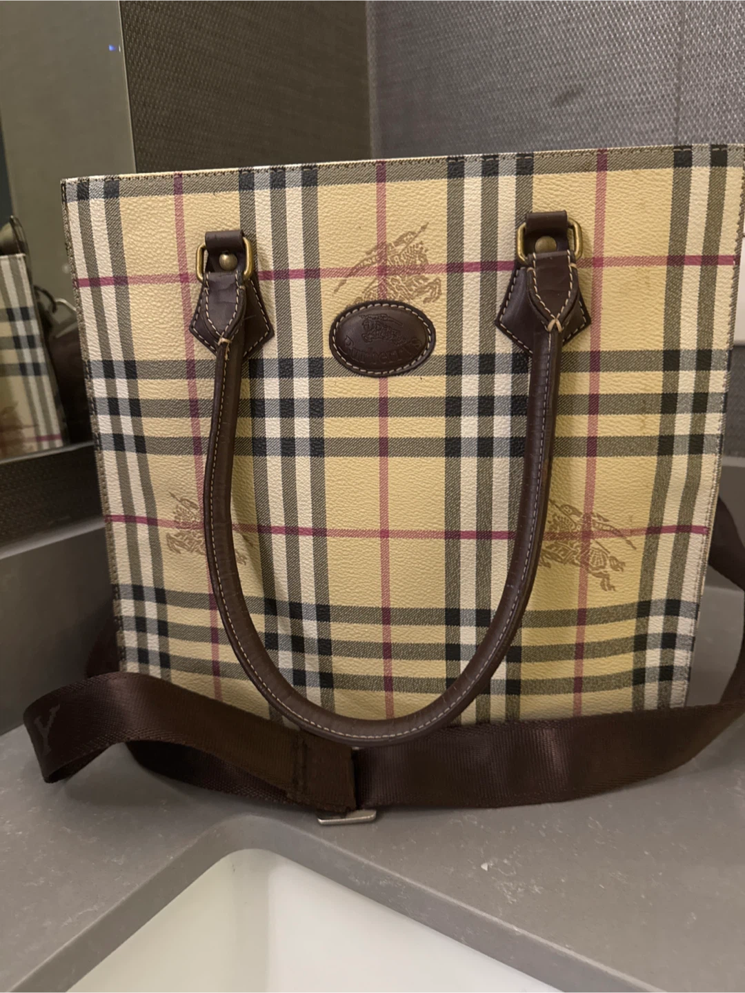 THIS is a timeless Burberry tote bag. It features the classic Burberry check pattern and brown leather accents. It has a shoulder strap which added for my convenience and is in excellent condition. Price is negotiable within reason. I misplaced the dust bag unfortunately however, I do have another dust bag that I will include. NO lowballing:)