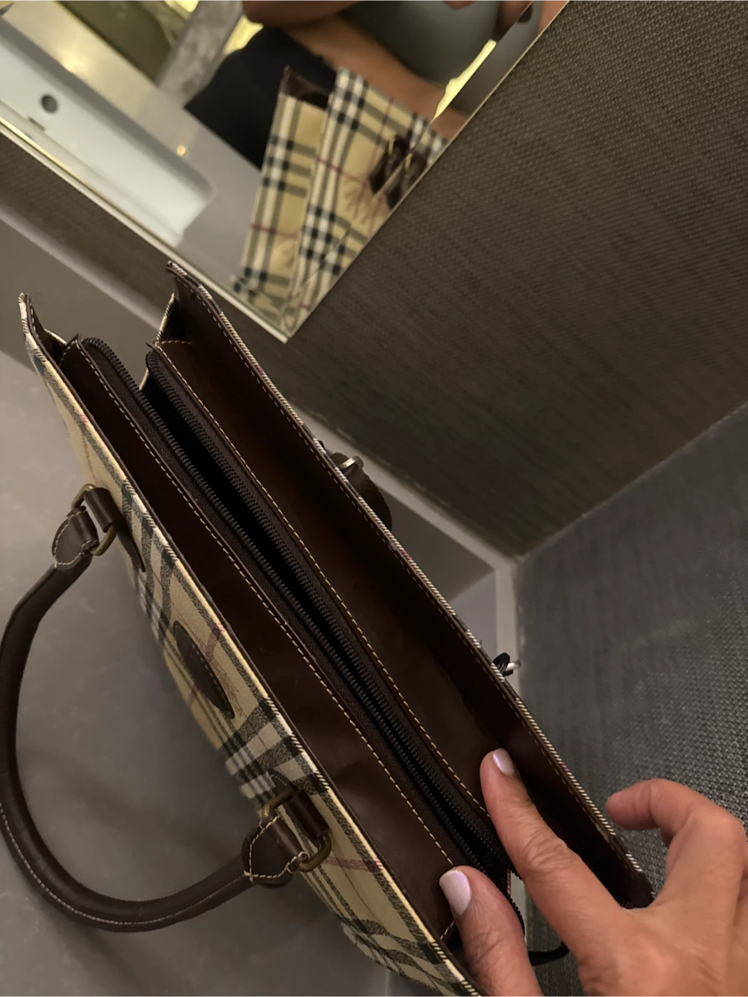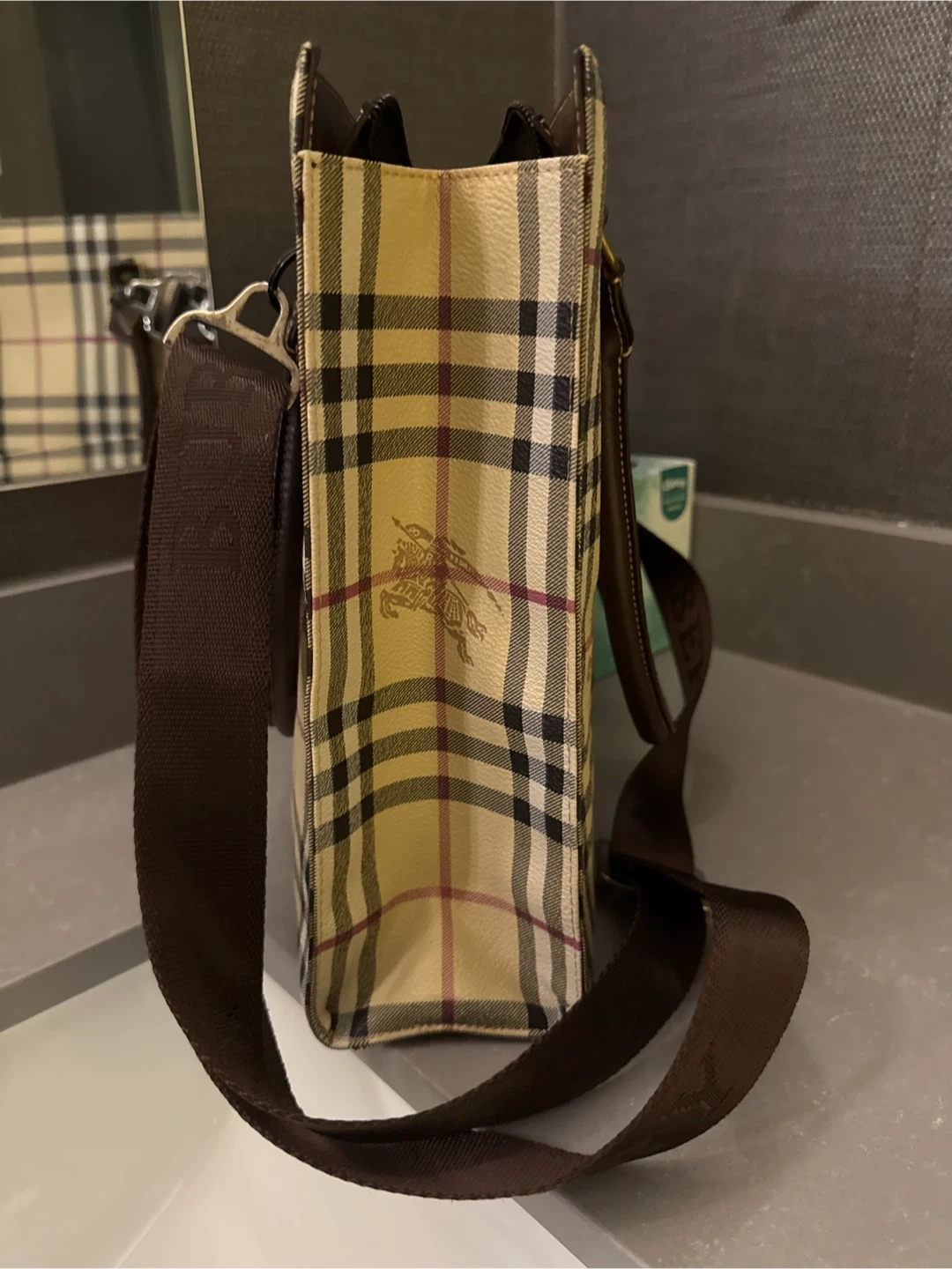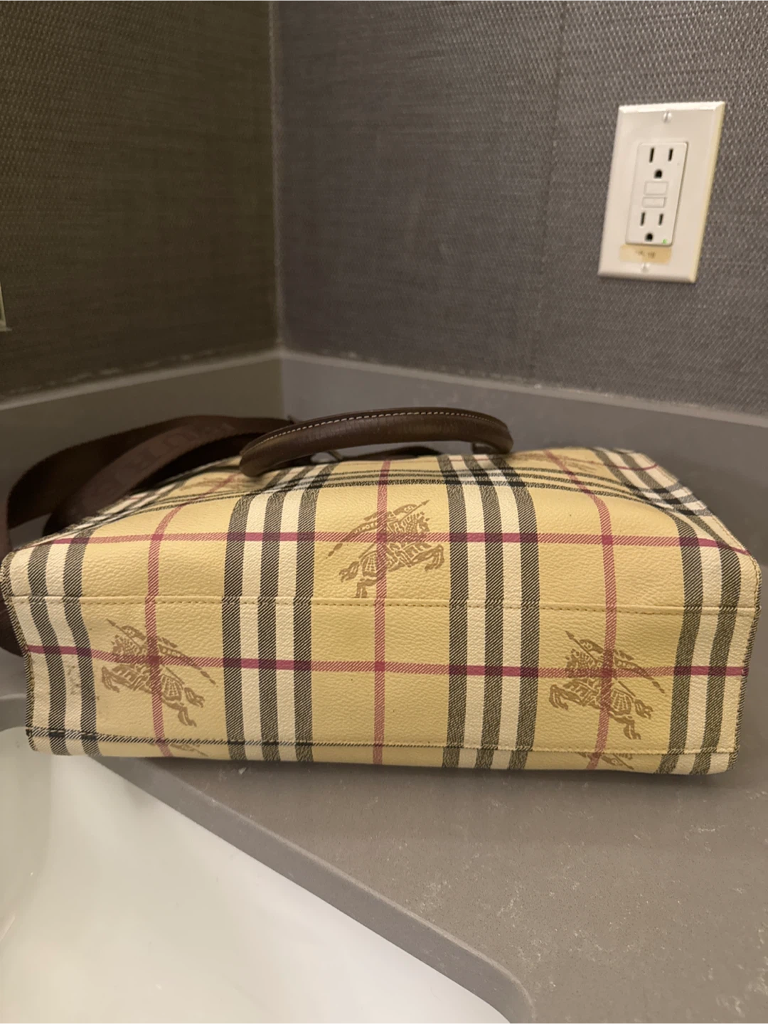 THIS is a timeless Burberry tote bag. It features the classic Burberry check pattern and brown leather accents. It has a shoulder strap which added for my convenience and is in excellent condition. Price is negotiable within reason. I misplaced the dust bag unfortunately however, I do have another dust bag that I will include. NO lowballing:)