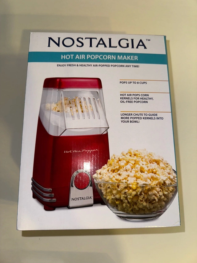 10Brand new Nostalgia hot air popcorn maker, still in its original packaging. Enjoy up to 8 cups of fresh, healthy, and oil-free popcorn in minutes. Its innovative longer chute ensures more kernels land right in your bowl. Featuring a distinctive push-button medallion for easy operation. Perfect for family movie nights or healthy snacking. Multilingual packaging included.