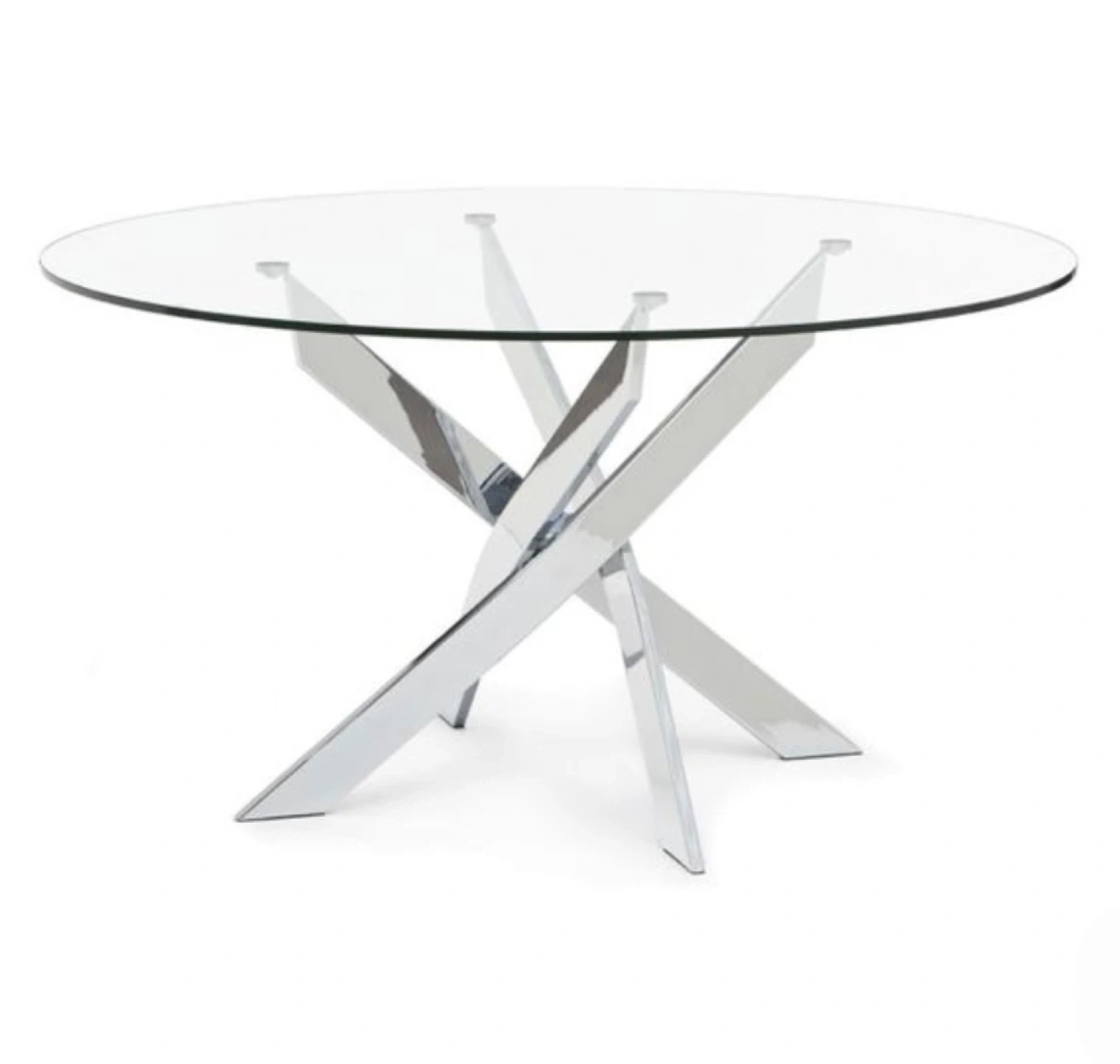 Selling a stylish dining table that would look great in any modern home! It features a clear glass top and a unique chrome base. It's in great condition and ready for a new home