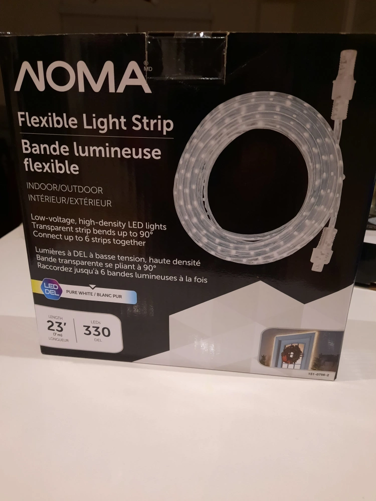 Selling a brand new NOMA Flexible Light Strip, still in its original box! It's 23 feet long and features low-voltage, high-density LED lights. The transparent strip bends up to 90° and you can connect up to 6 strips together. Perfect for indoor or outdoor use!