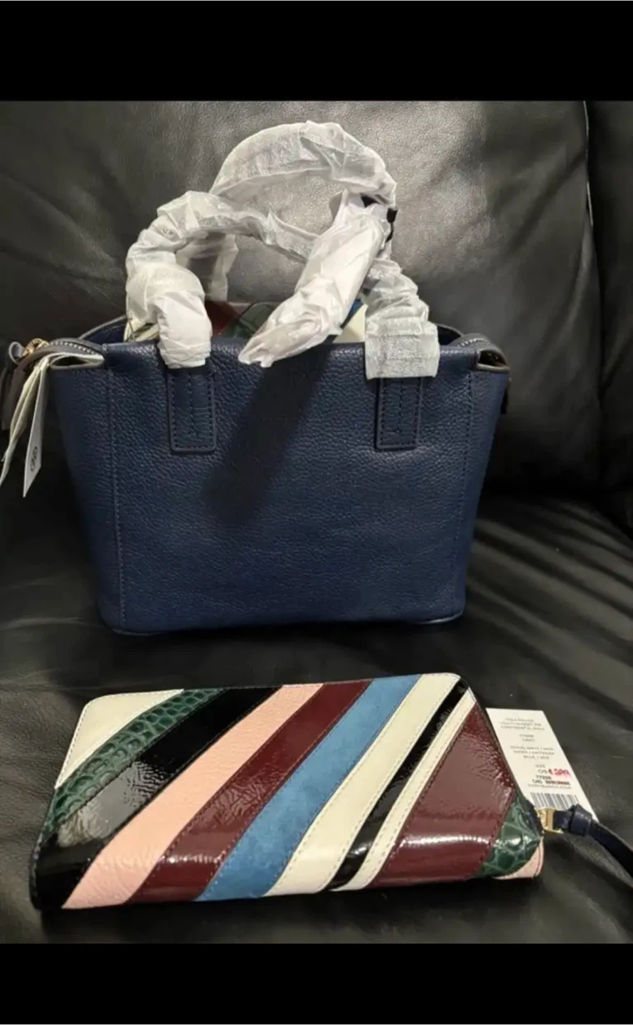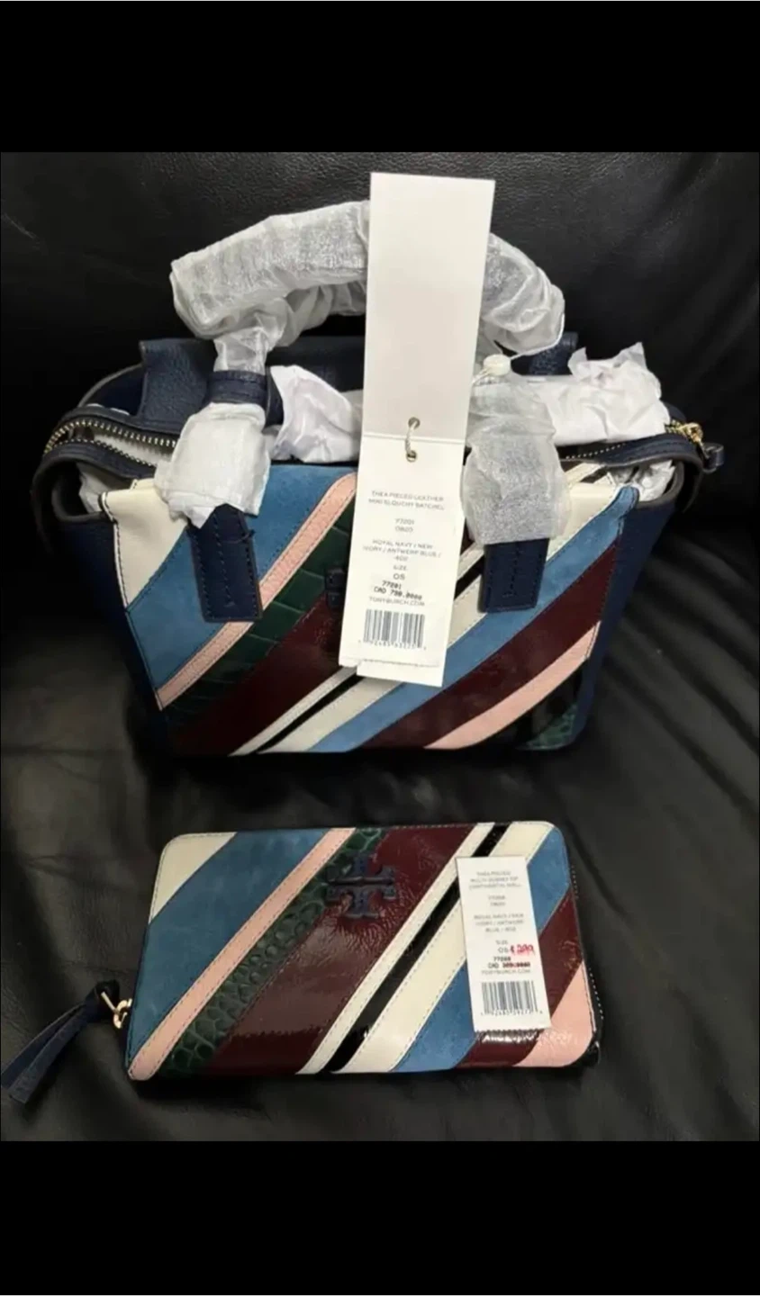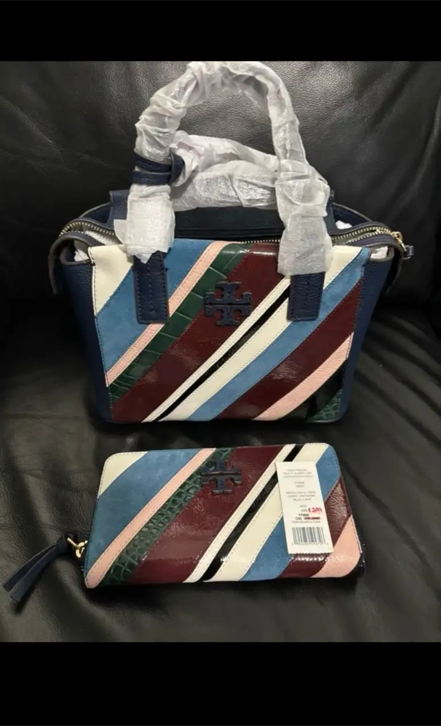 Brand new with tags. Gorgeous Tory Burch handbag and wallet set. Multicoloured striped design. Navy blue base colour. Perfect for everyday use.