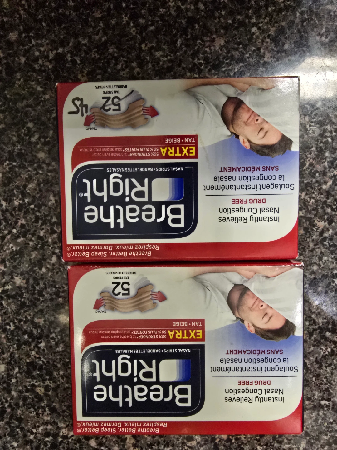 Selling two boxes of Breathe Right nasal strips. One unopened box contains 52 strips in the tan colour and the other is opened and contains 45 strips. They help relieve nasal congestion instantly and are drug-free. Breathe better and sleep better!