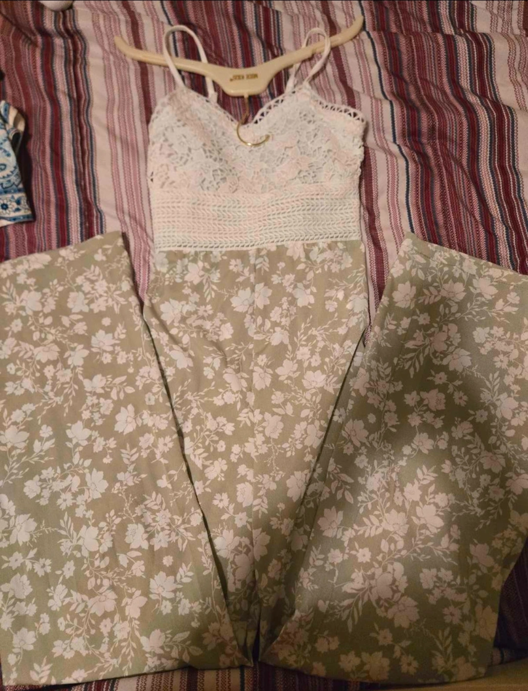10Super cute floral print jumpsuit. It's perfect for a summer day or a casual outing. The jumpsuit features a delicate lace bodice and flowy pants. It's in great condition and ready for a new home