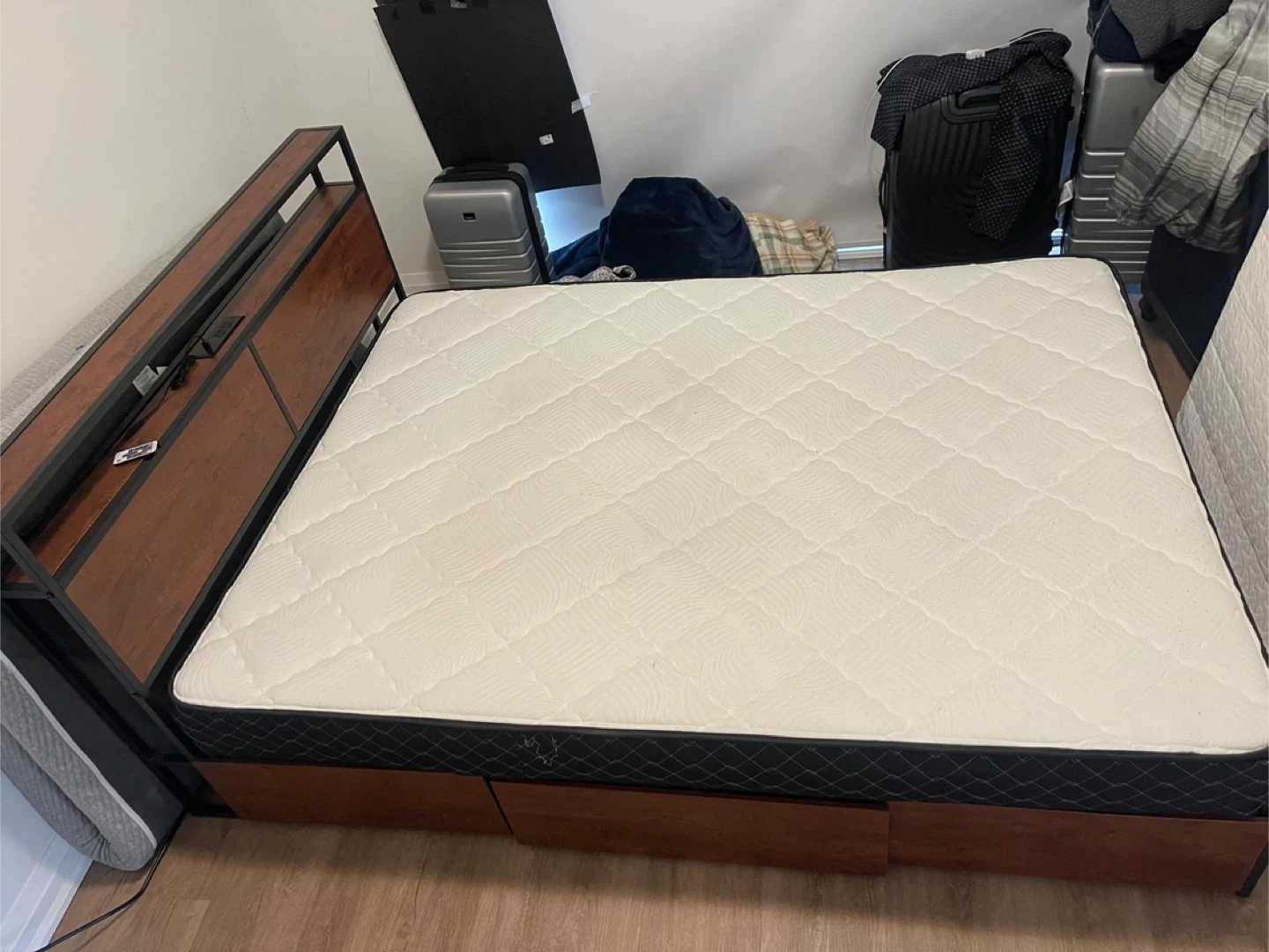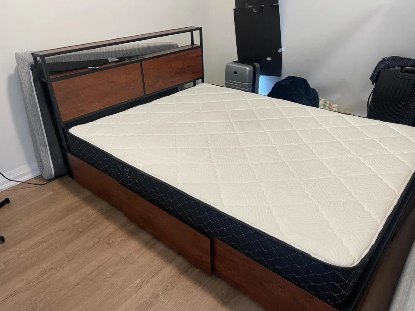 73Selling a queen size bed frame with a mattress. The bed frame is a dark wood with a black metal frame. There are drawers at the bottom of the bed for extra storage. The mattress is included and in good condition. It's a comfortable setup ready for a new home