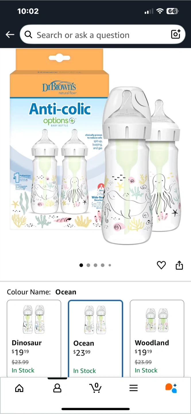 I'm selling a set of Dr. Brown's Anti-Colic Options+ baby bottles in the Ocean design! These bottles are designed to reduce colic, spit-up, burping, and gas. They are wide-neck bottles, each with a 9 oz/270 mL capacity. Originally bought for $23.99, the box is included