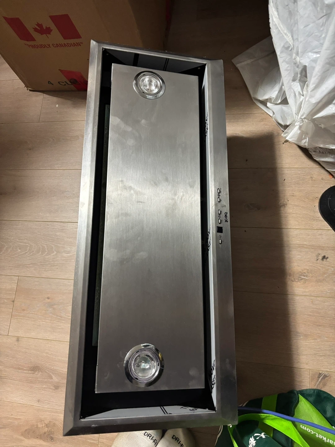 Selling a used stainless steel range hood. It has some signs of use, but is still in good working condition. Perfect for any kitchen! Thought the Lights glass is broken :(