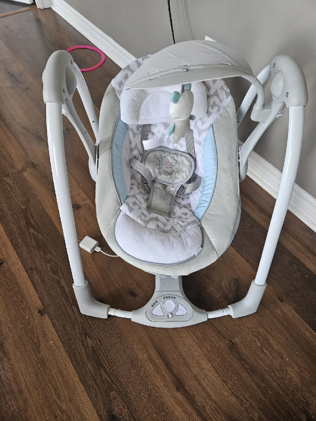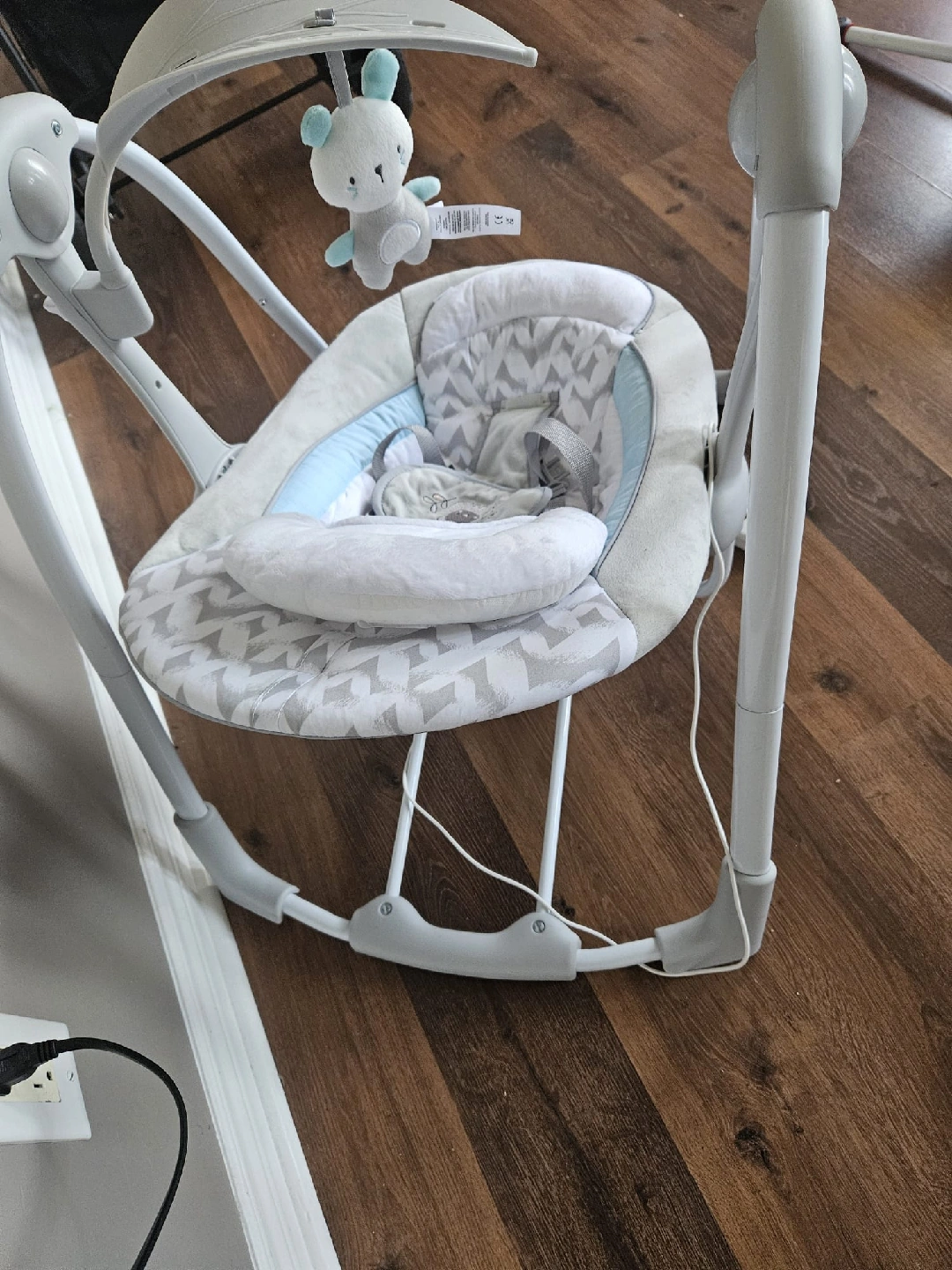 Selling a Graco Soothe 'n Sway LX baby swing in excellent condition! This swing is perfect for soothing your little one with its gentle swaying motion and various speed settings. The soft, comfortable seat and overhead mobile will keep your baby entertained and relaxed. Originally bought for $99.97