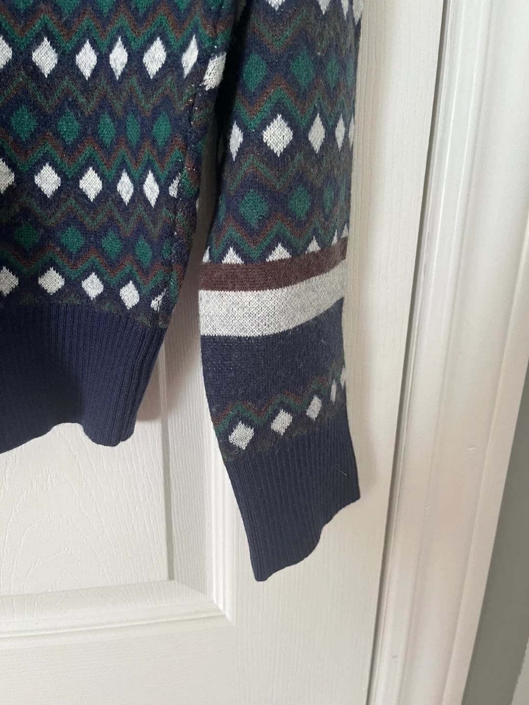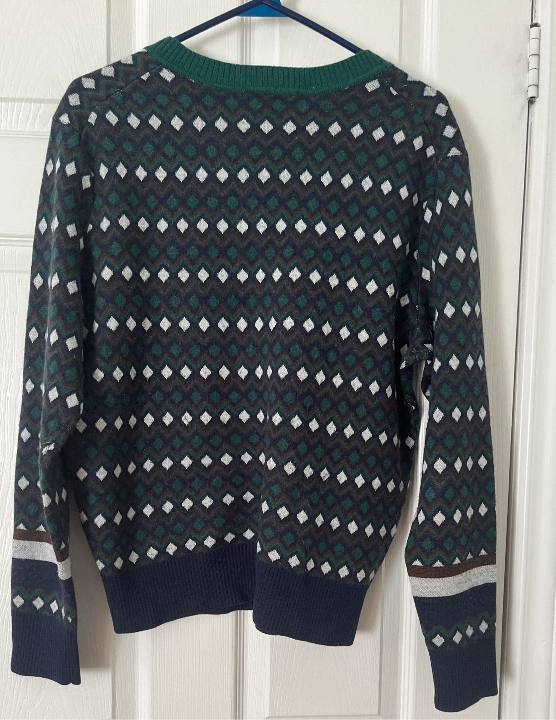 Here's a cozy sweater from Simons' 31 line! It's a size medium with a classic argyle pattern in shades of green, navy, and white. Perfect for adding a touch of style to your wardrobe.