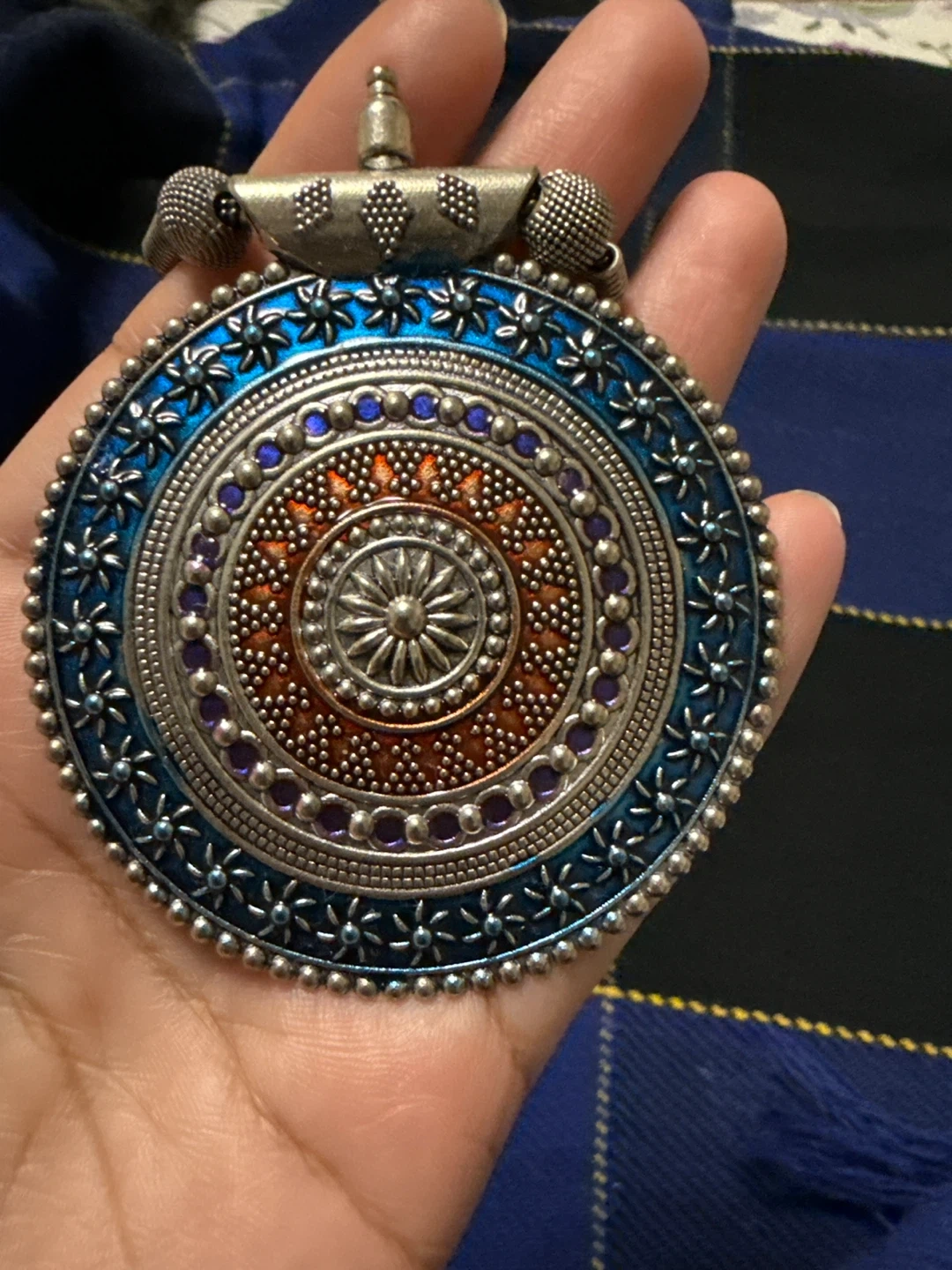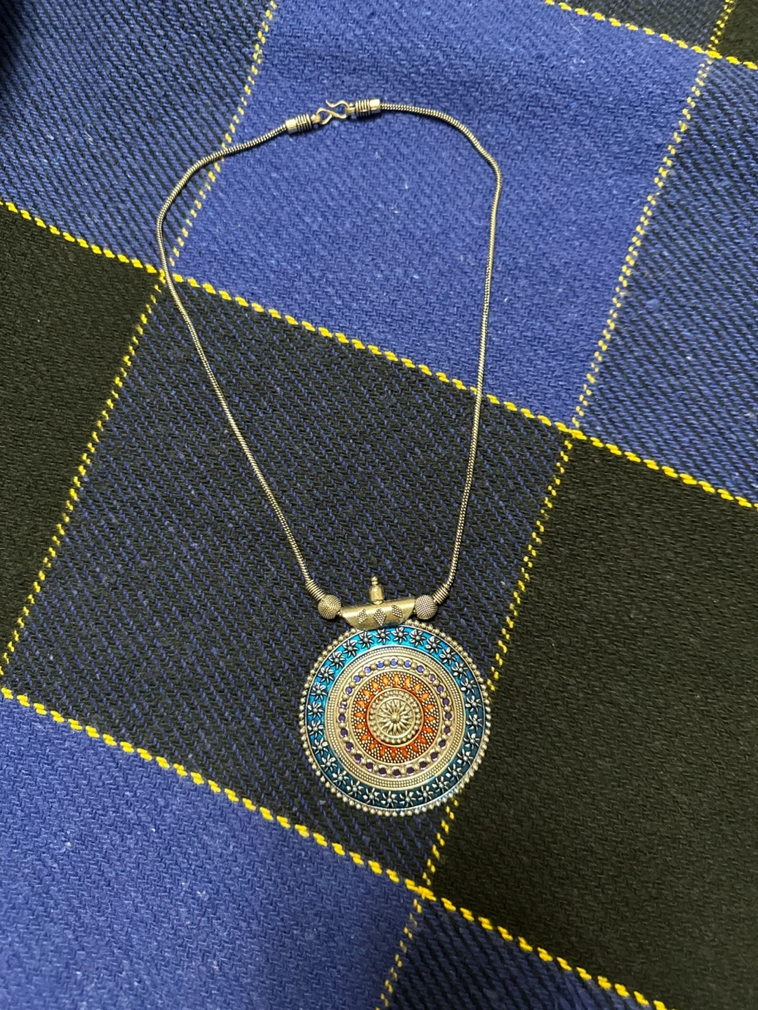 Beautiful silver-tone necklace with a colourful mandala pendant. The pendant features intricate detailing and vibrant colours, making it a unique accessory to add to your collection!