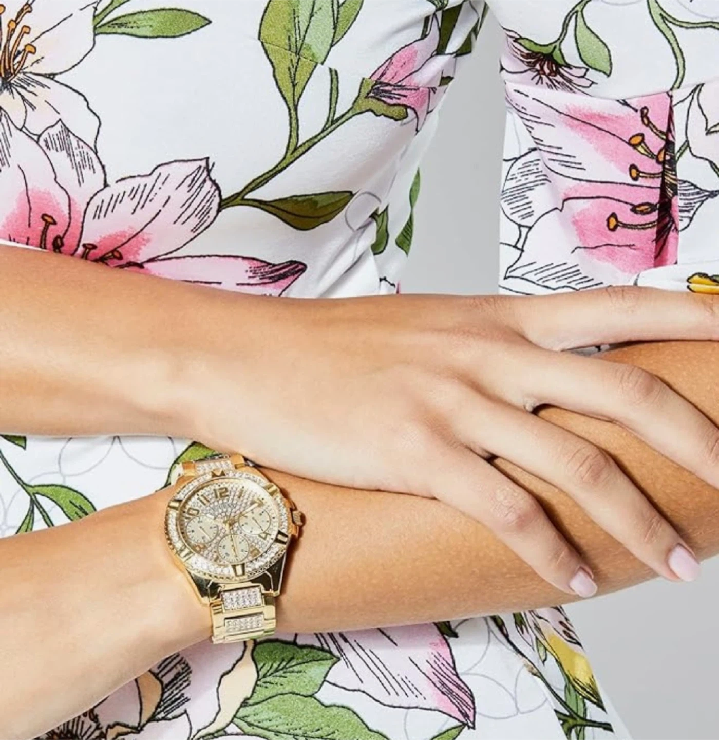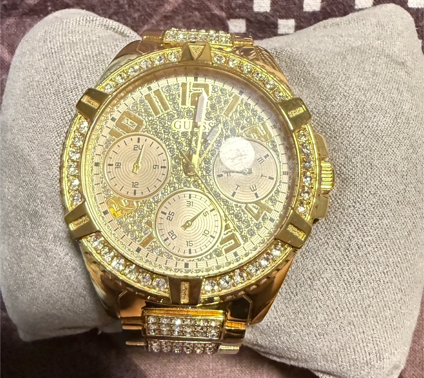 Selling a beautiful gold Guess watch! It's in great condition and comes with its original box. The watch features a stunning design with diamond accents. A stylish accessory to elevate any outfit! Bought it but I wore it once. Battery need to be replaced.